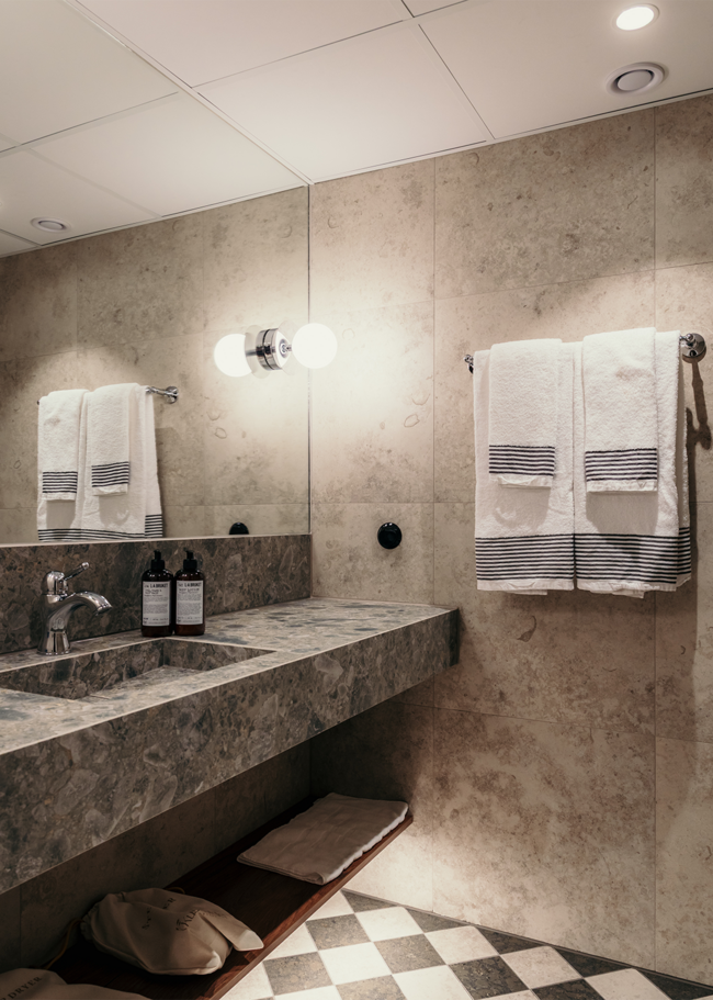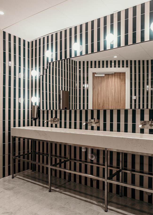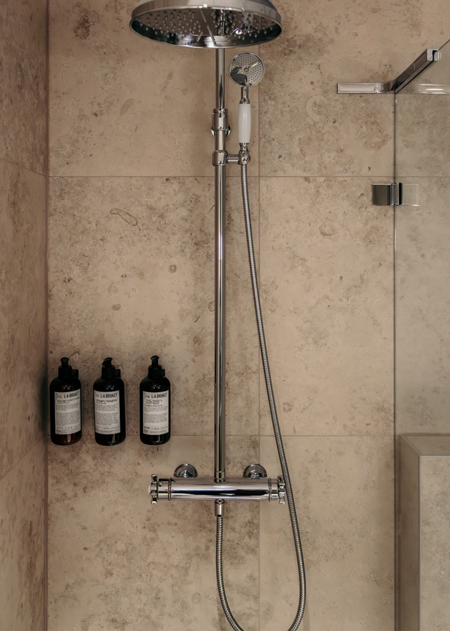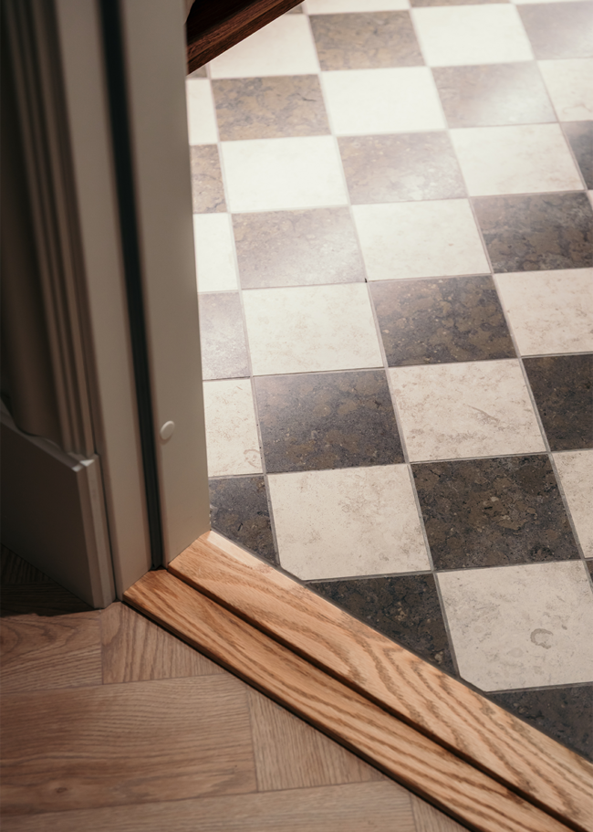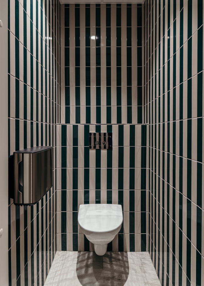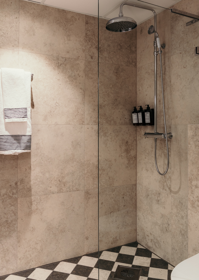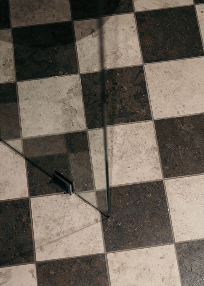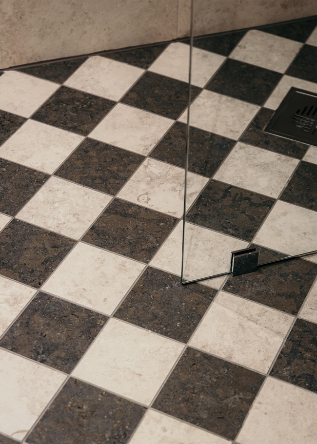 On the floor in this bathroom, Glanshammar White Matt is used, a light white-grey series with dark grey veining and a matte, slip-resistant surface.