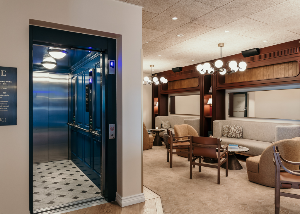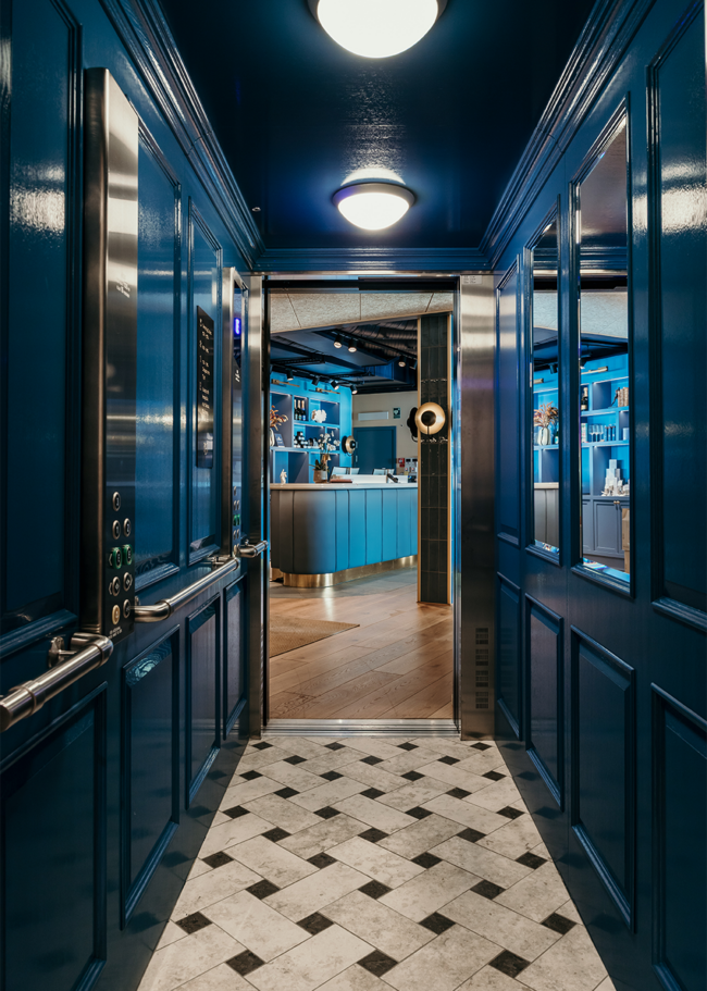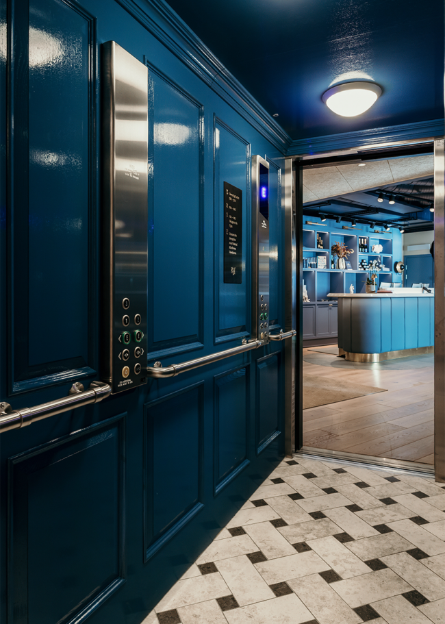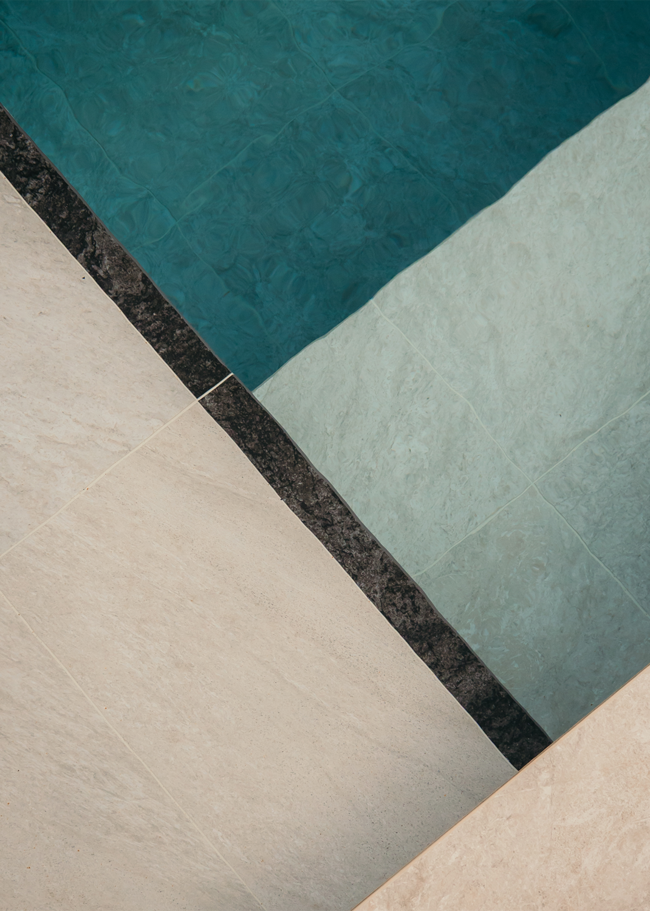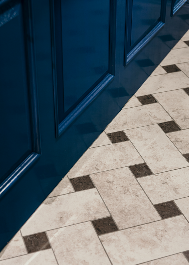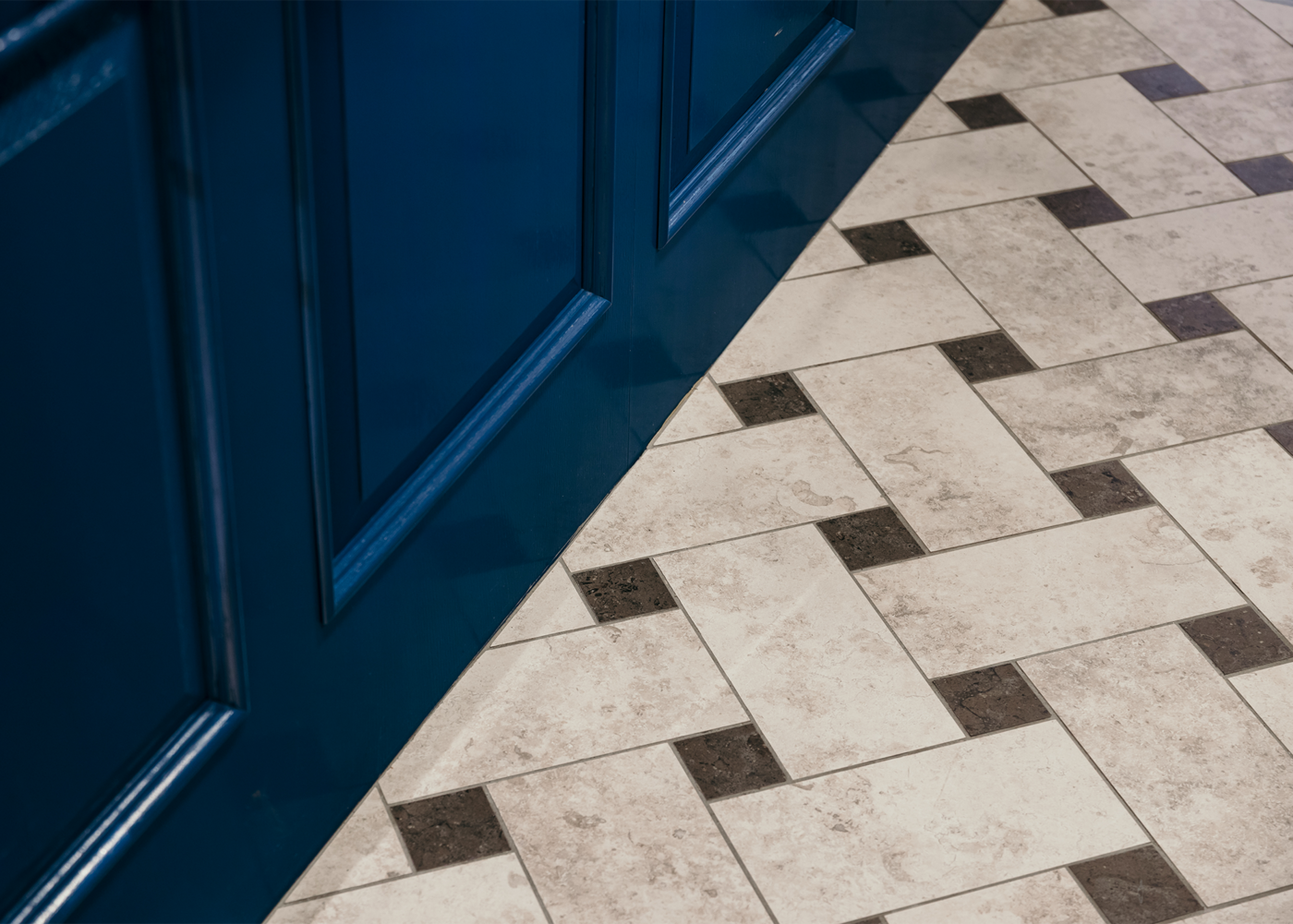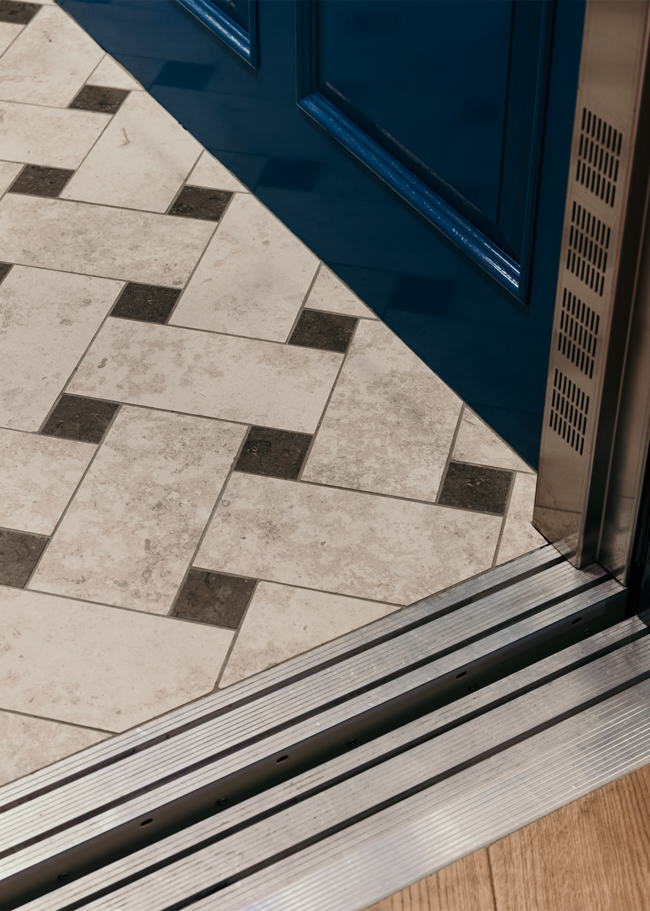 On the floor in this bathroom, Glanshammar White Matt is used, a light white-grey series with dark grey veining and a matte, slip-resistant surface.