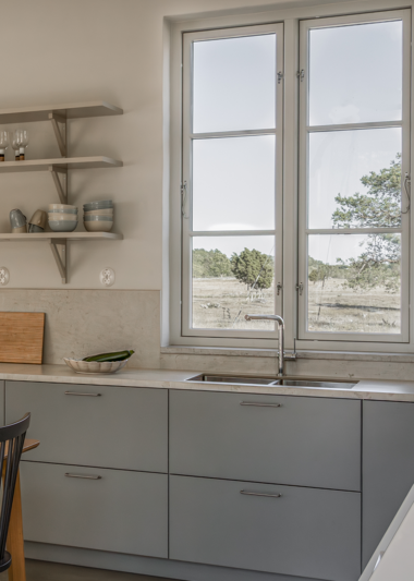 Fitted kitchen with wall and window niches covered in patterns by Stig Lindberg