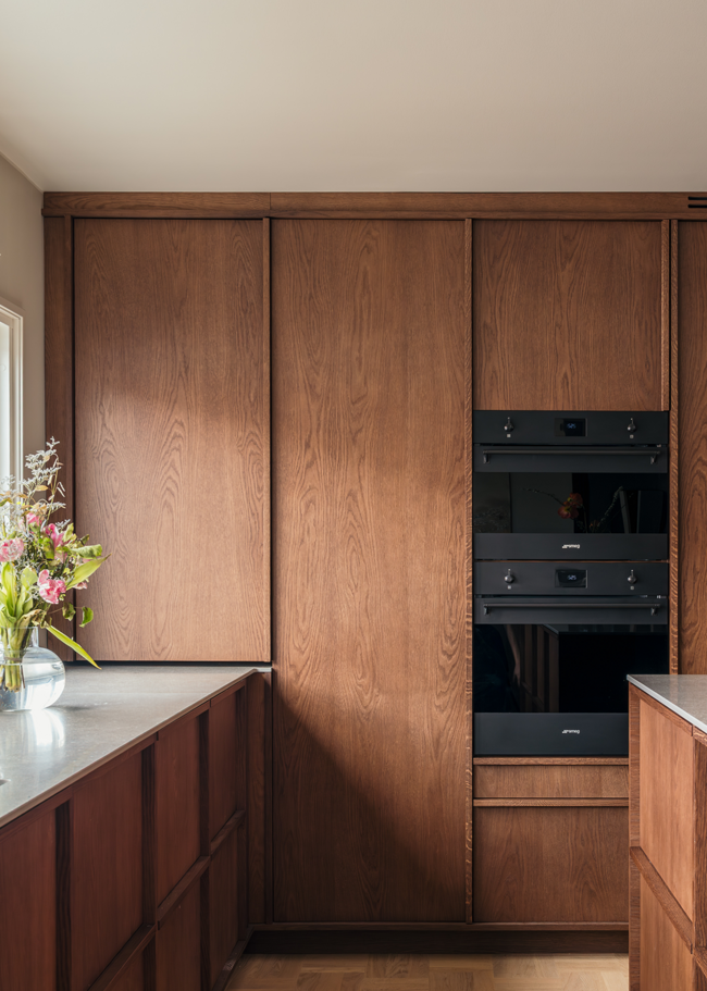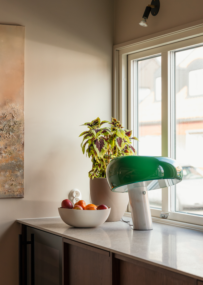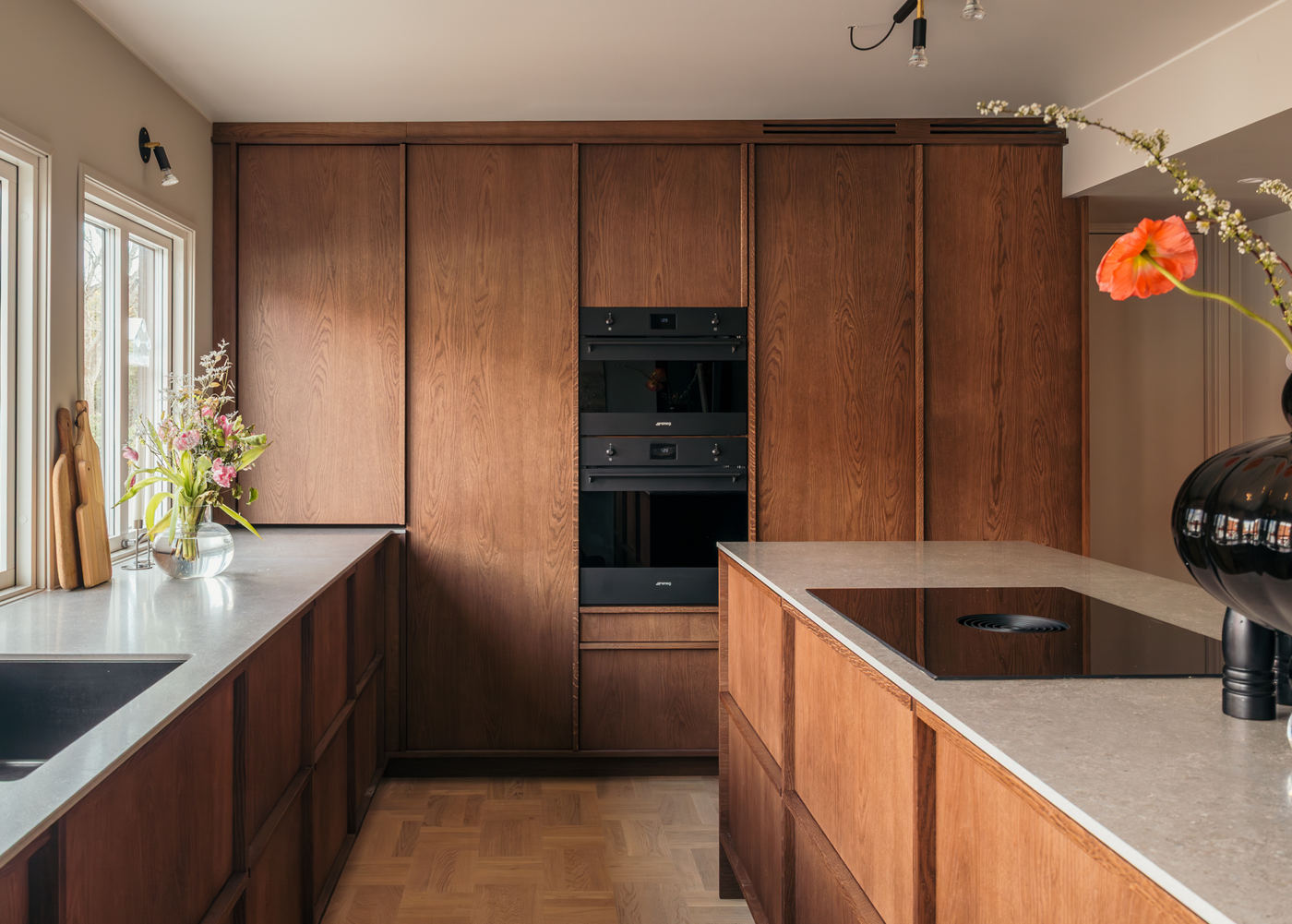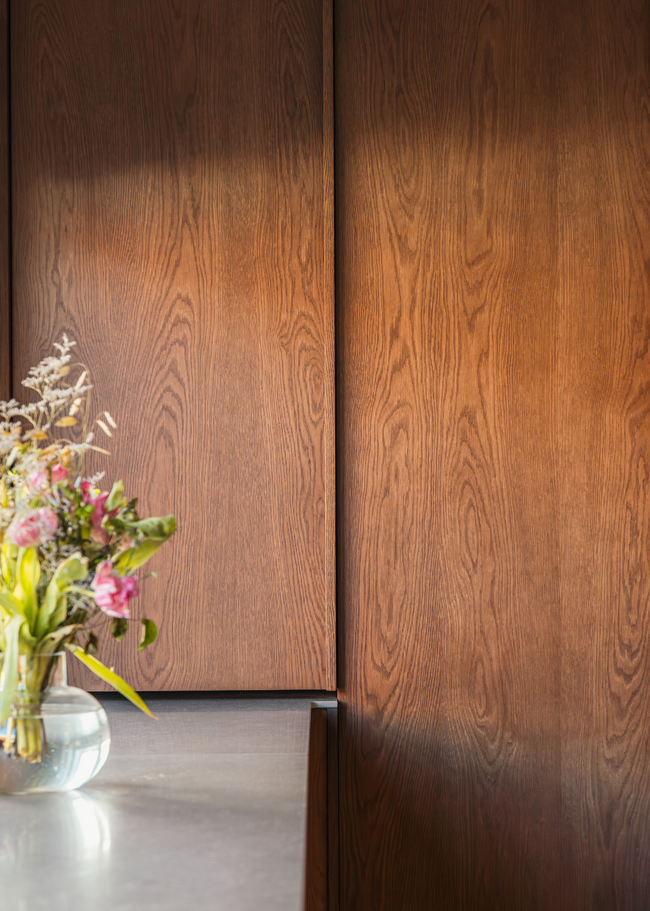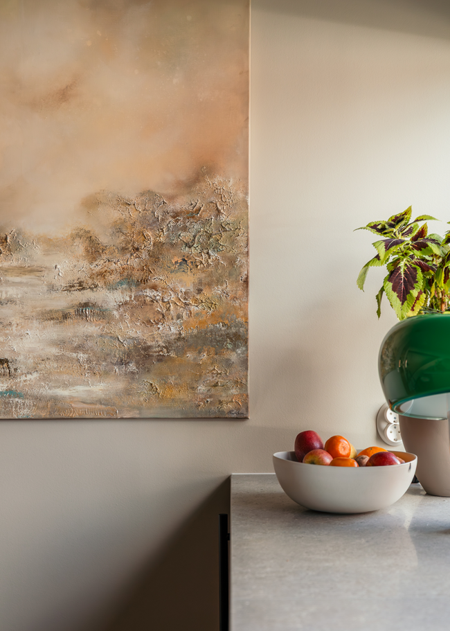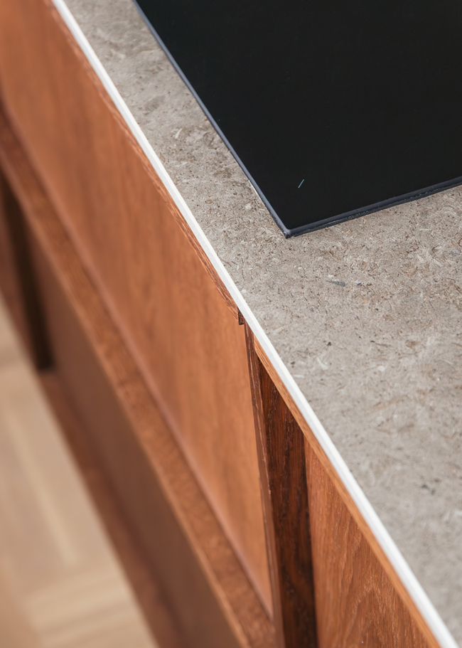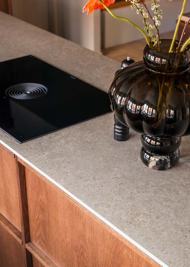 The light countertop from the Stone Select seires, crafted in 12 mm porcelain stoneware, sets the tone for this kitchen. Its surface has a soft, natural texture that creates an exclusive feel without seeming cold. It provides a calm contrast to the warm wooden cabinetry. More than just a workspace, the countertop becomes a central design feature that ties together the wood finishes and the soft lighting of the kitchen.