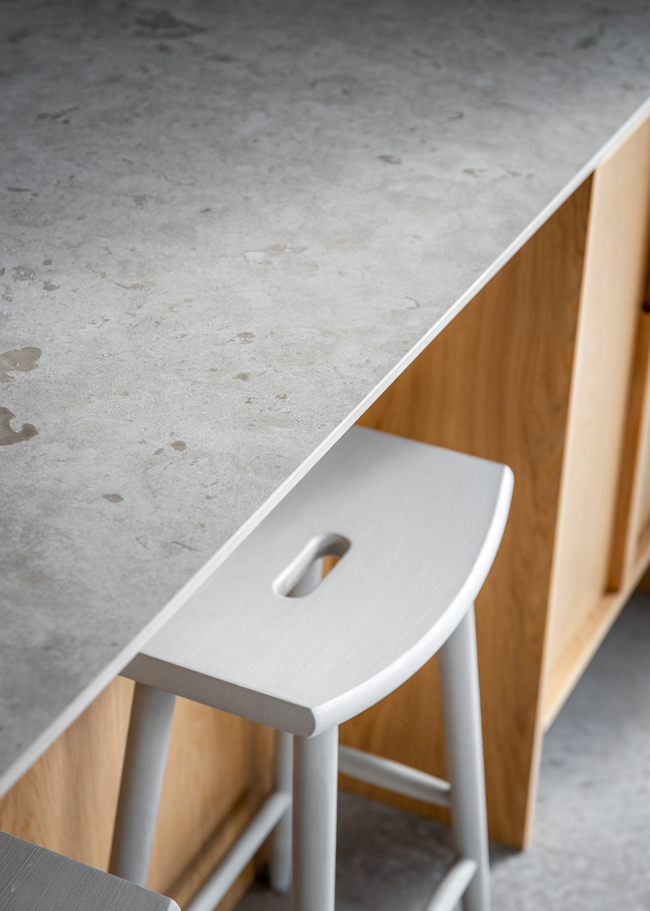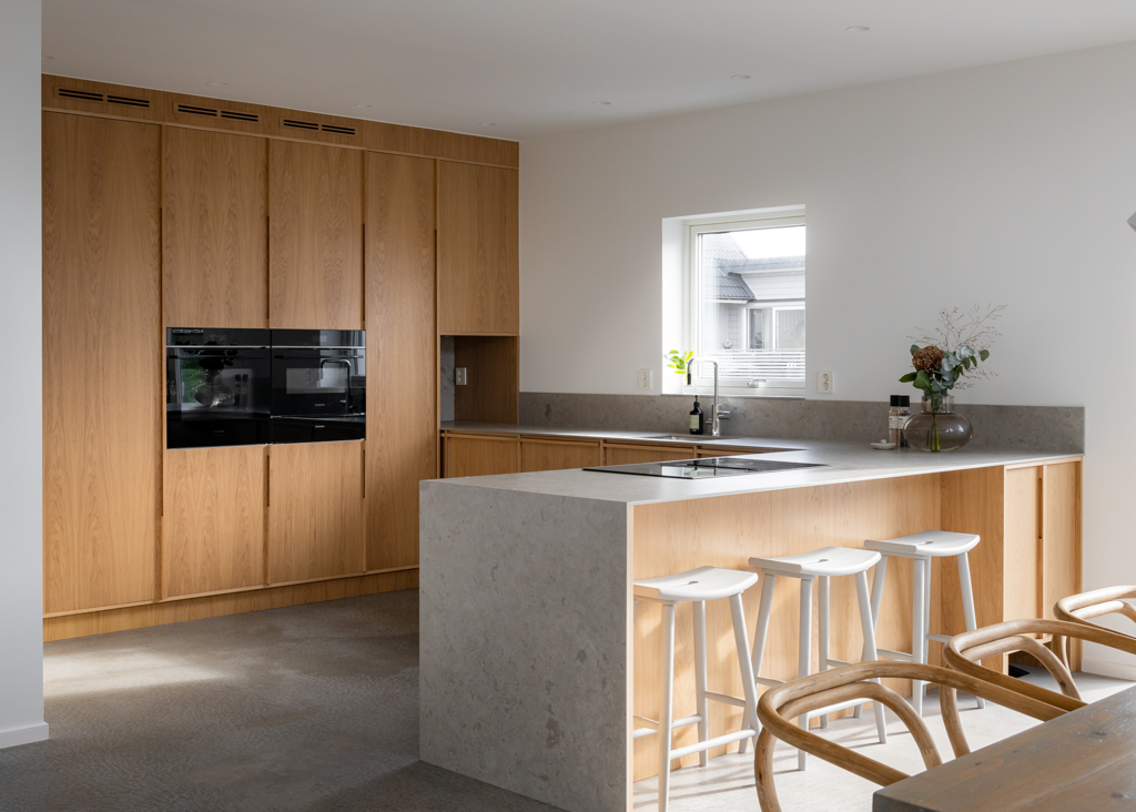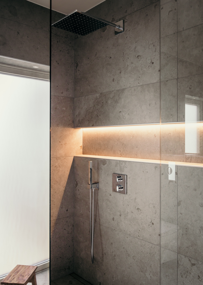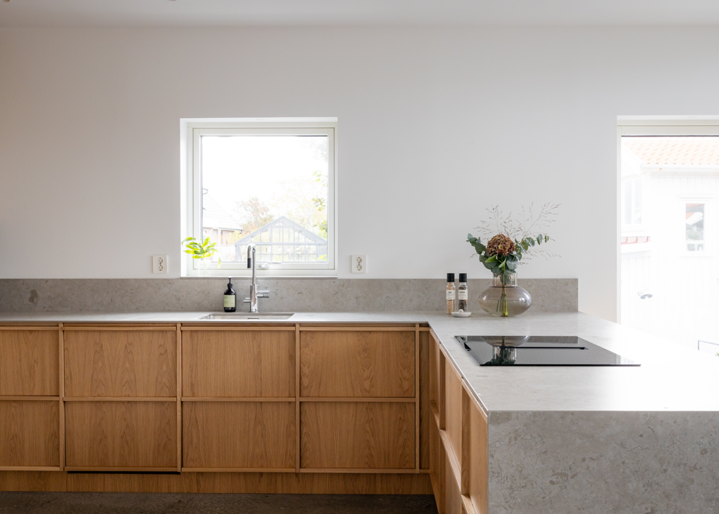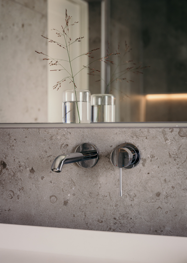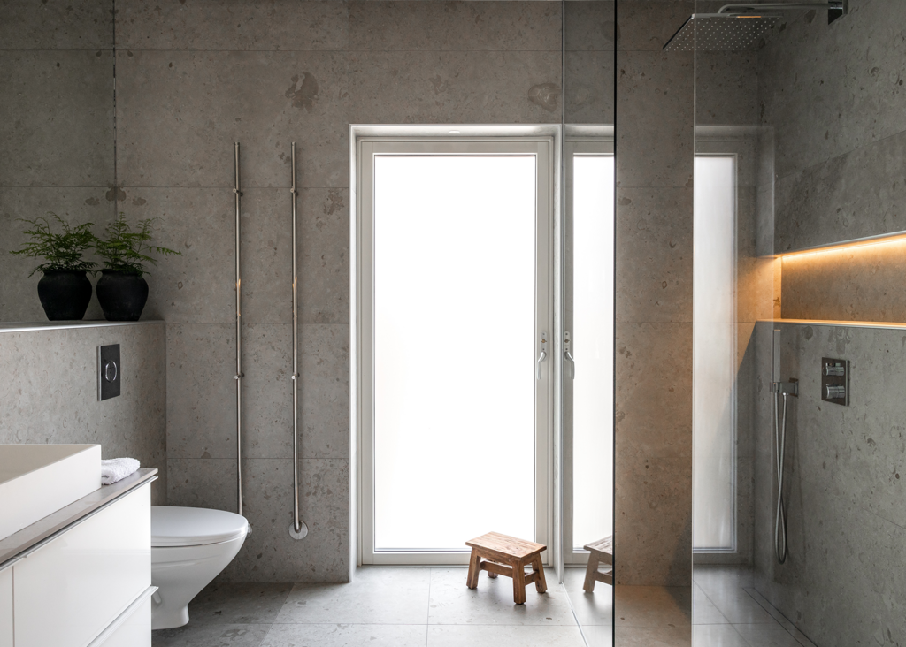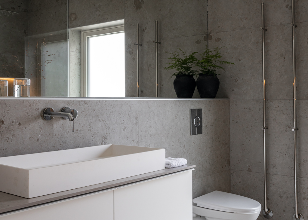 In this tastefully decorated villa, Norrvange Light Gray has been used as a counterop in the kitchen, as well as a floor and wall tile in the bathroom.