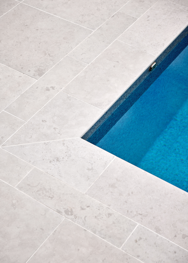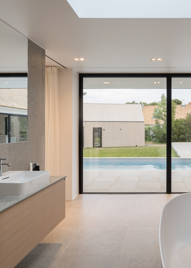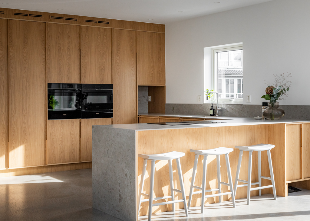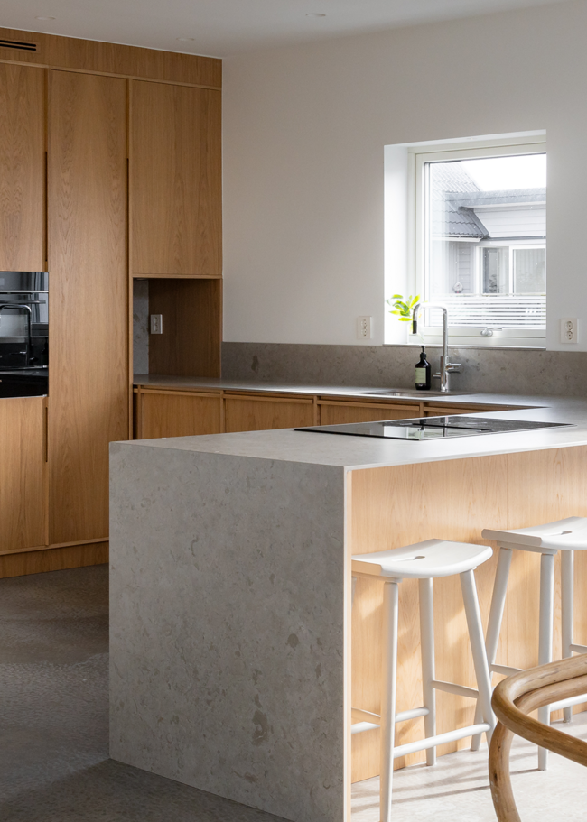 Villa Halland – A house with Jura Select Ivory in the kitchen, bathroom, and around the fireplace, blending seamlessly with nature.