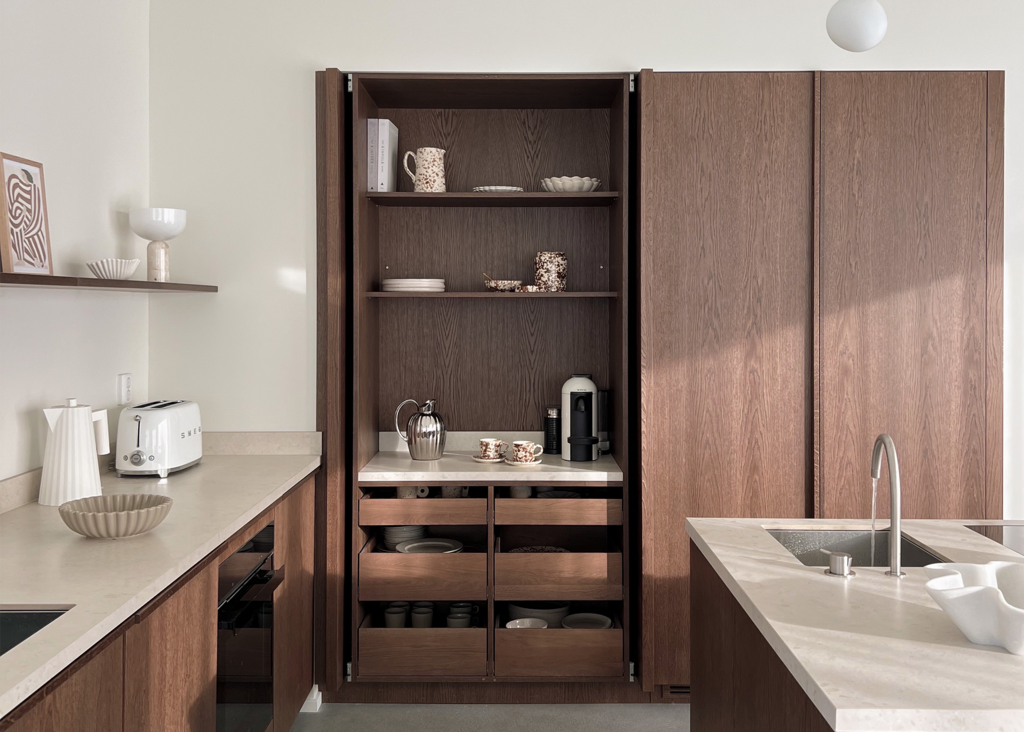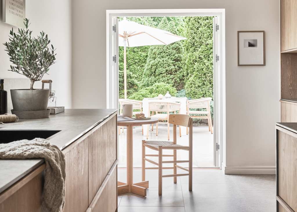 Villa Täby - Elegant kitchen and outdoor patio in warm grey tone and limestone feeling