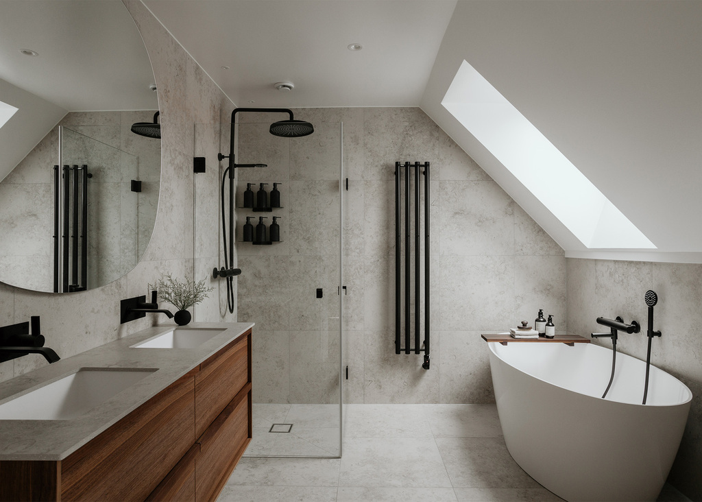 Porcelain stoneware is very well suited for the bathroom due to that the surface is easy to maintain. In addition, a nature-inspired finish creates a sense of calmness in the room. Bricmates porcelain stoneware can be used for both walls and floors, with sizes ranging from mosaic (5x5 cm) to larger formats up to 60x120 cm. The same surface can also be used as a vanity top for a sleek blend with the rest of the surroundings.