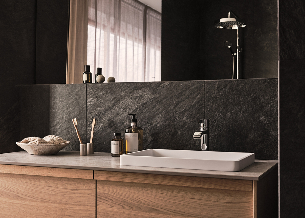 To create contrasts, you can combine dark floor and wall tiles and vanity tops with lighter bathroom furniture, ranging from vanities and cabinets to handles, taps, and showers. Alternatively, you can let the entire bathroom follow a consistent dark colour scheme for a more sleek and uniform look.