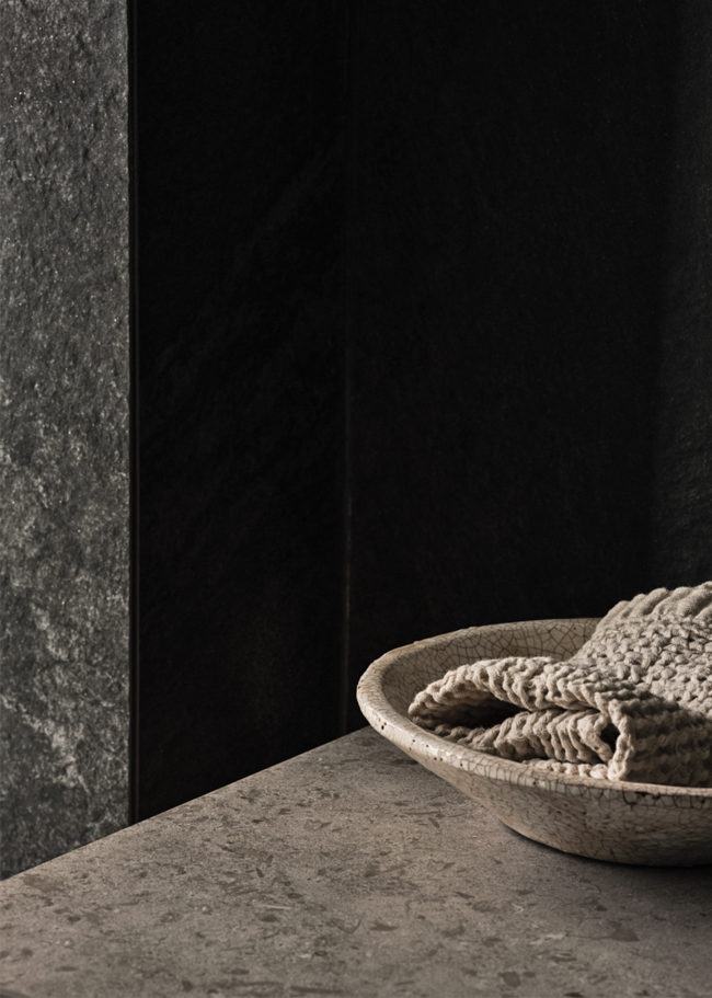 In this bathroom, the black wall and floor tiles from the Quartzit Black series catches the eye, with their natural close and deep colour. The series is inspired by the textured cliff walls of the archipelago, bringing you closer to nature than ever before.