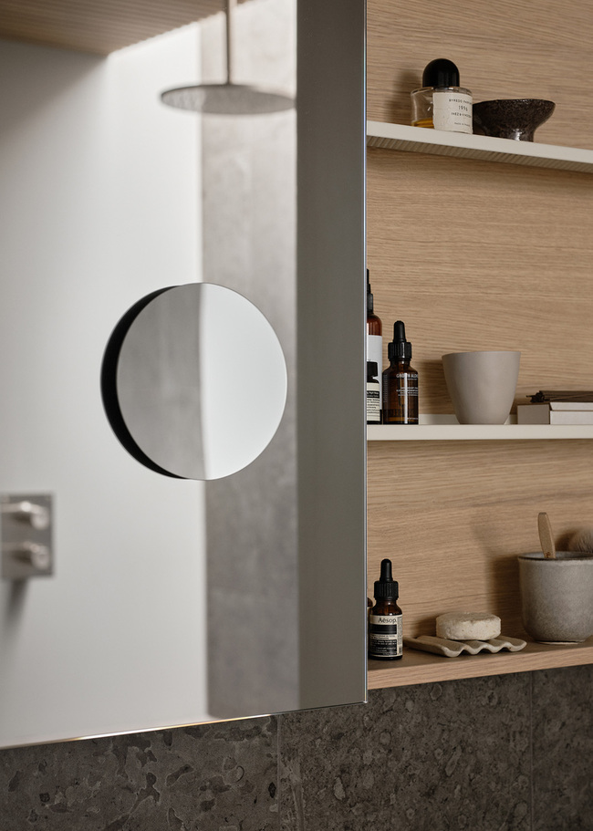 The grey shades are combined with elegant wooden details, including wood panelling on the ceiling and oak vanity and wall cabinets. Some walls are painted in Jotun Vallmofrö, a lighter grey shade that creates a beautiful contrast to the darker tiles.