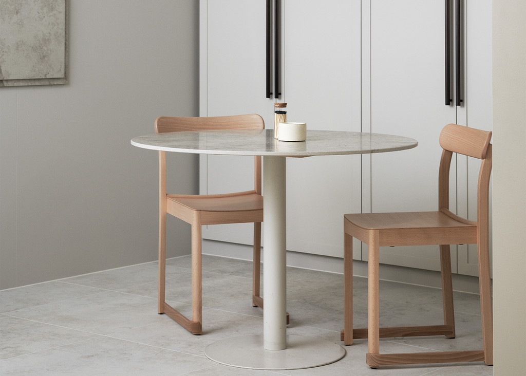 Create unique table legs using Bricmate’s countertops. In this project, 12 mm thick slabs from the Glanshammar White series have been joined together into rectangular blocks.The tabletop can be made from any material; in this case, a sturdy light wood was chosen, creating a look that is both robust and refined.