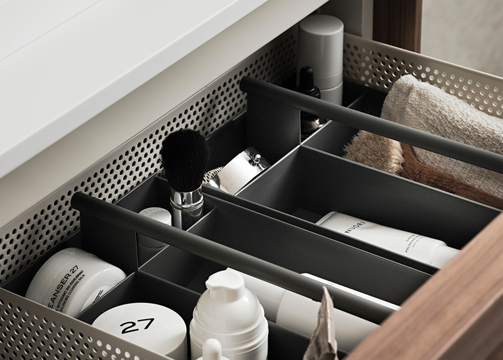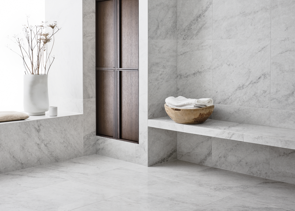 The rectangular block can also be used as steps or stairs, for example by the bathtub or hot tub. This requires tiles in larger formats, such as 60x120 cm, as well as the possibility to adjust the tiles by cutting them into different sizes.