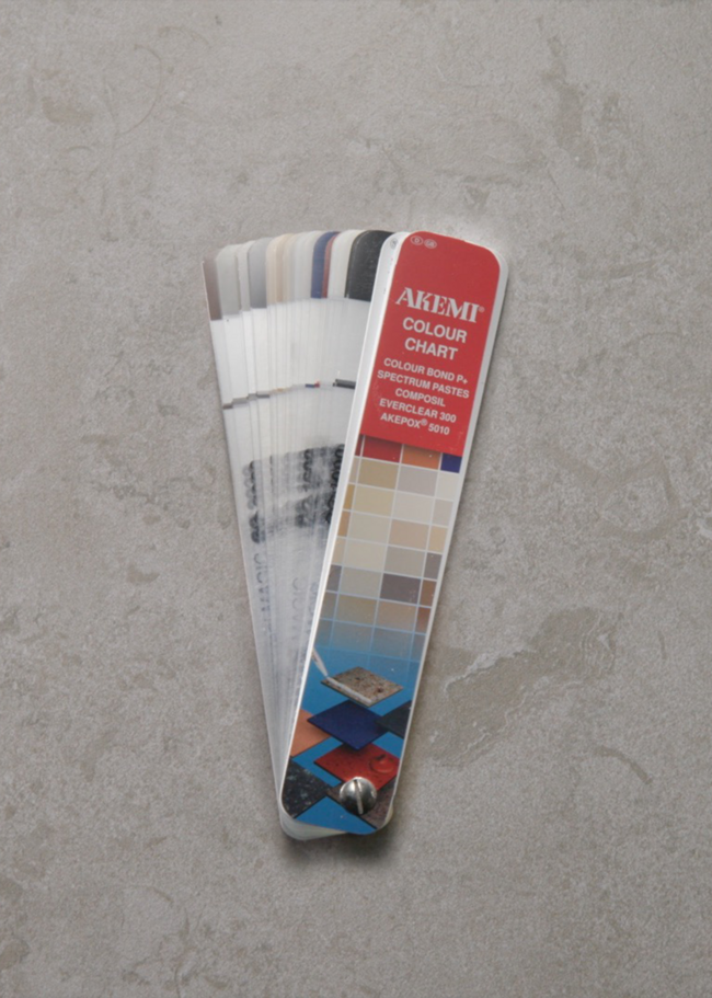 Det andra alternativet är att använda en färgkarta från AKEMI för att se vilken färg som harmonierar bäst med plattan eller skivan.