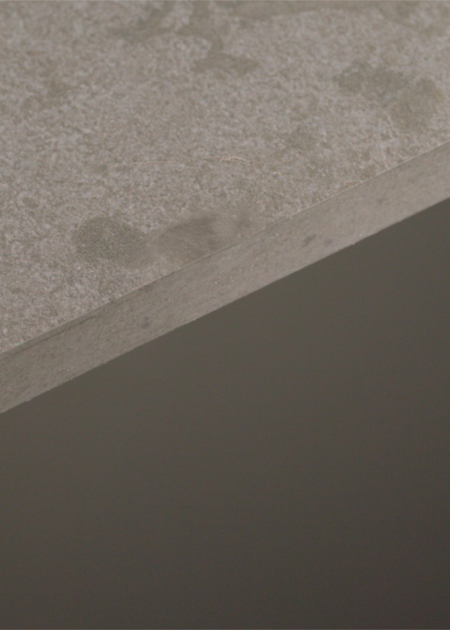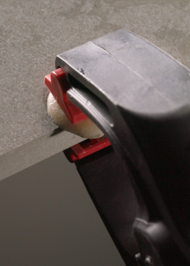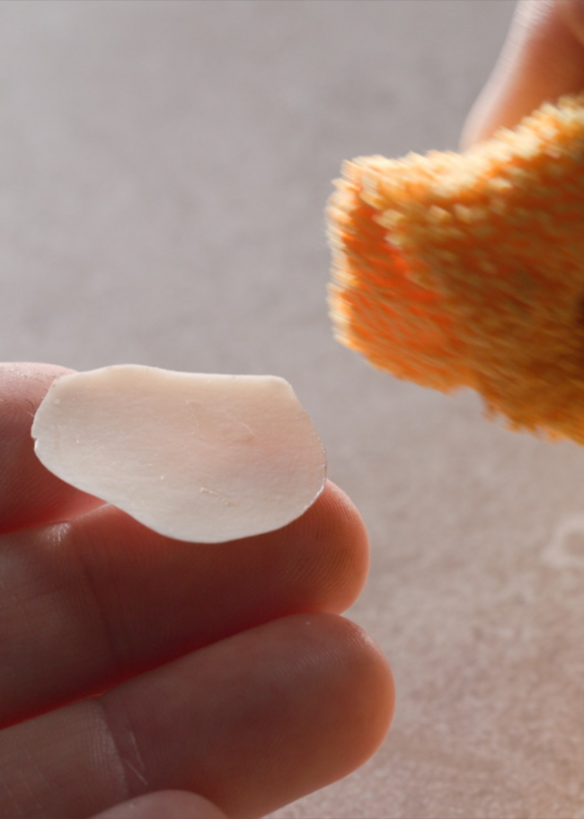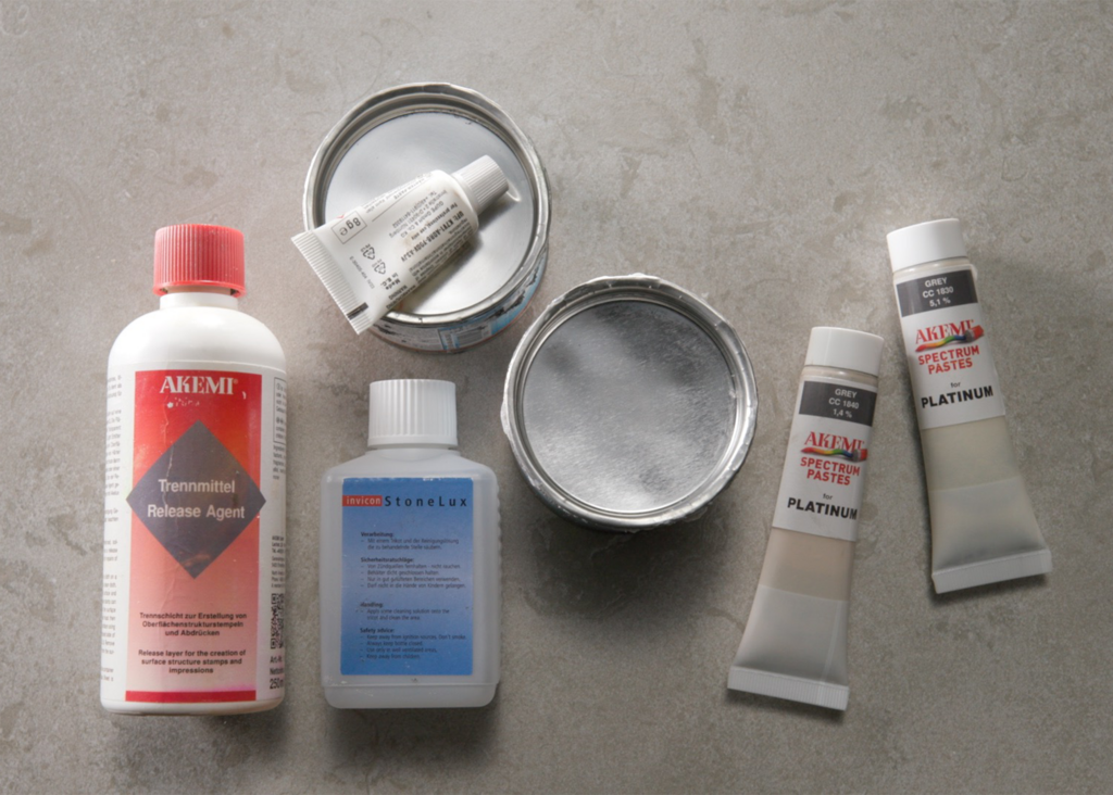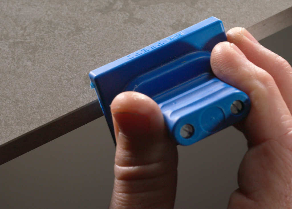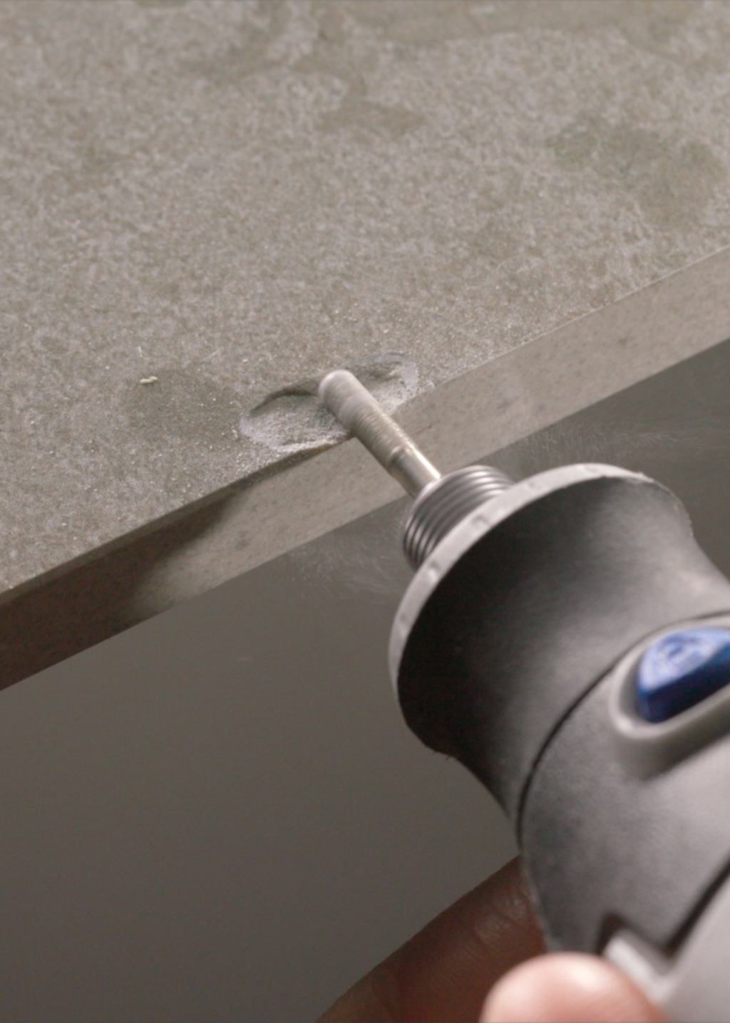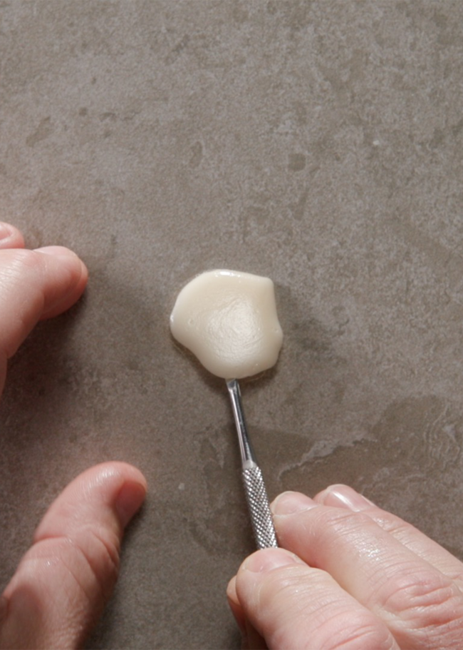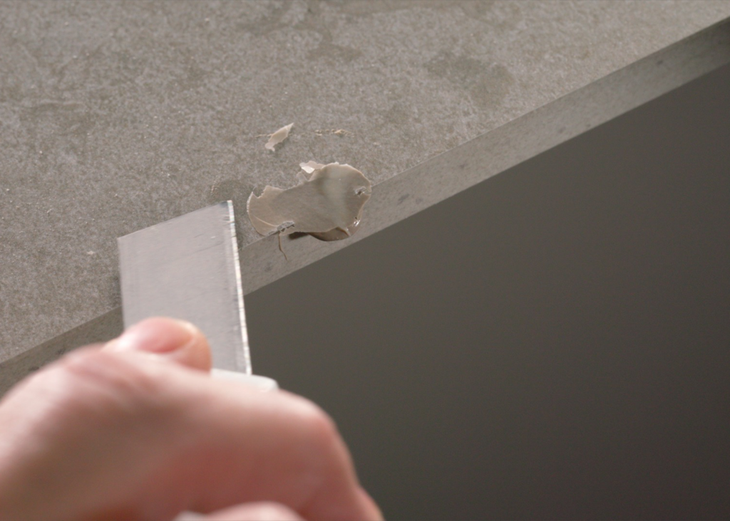 Rengör den sida av formen som har legat mot granitkeramiken med en mikrofiberduk och lite lösningsmedel. Placera sedan formen mot blandningen av reparationsmassa, färgpigment och härdare. Fäst formen med en tving så att den trycks ordentligt på plats och låt den sitta kvar tills materialet har härdat. När allt har stelnat tar du försiktigt bort formen med ett pickverktyg.