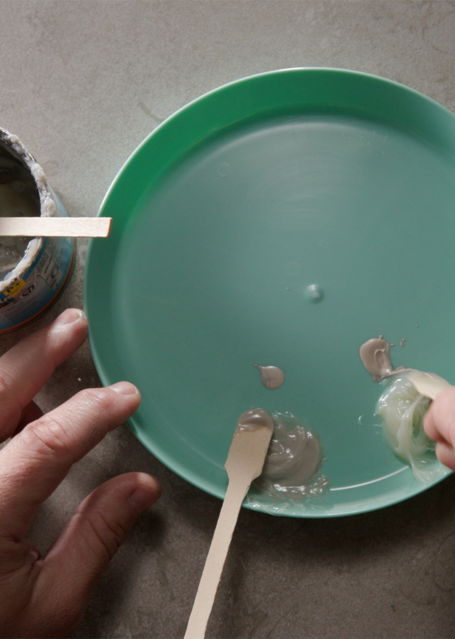 I en behållare, blanda reparationsmassa med färgpigment för att matcha färgen på granitkeramikens yta. Håll upp färgen mot ytan och dubbelkolla så att färgnyanserna går väl ihop. Därefter, addera härdare och blanda igenom noggrant.
