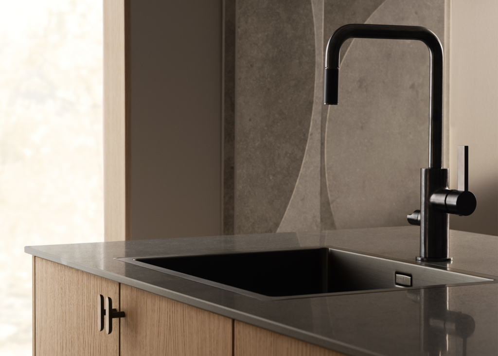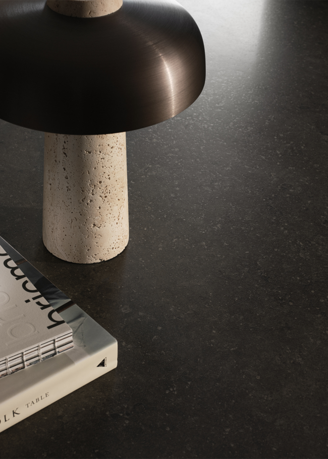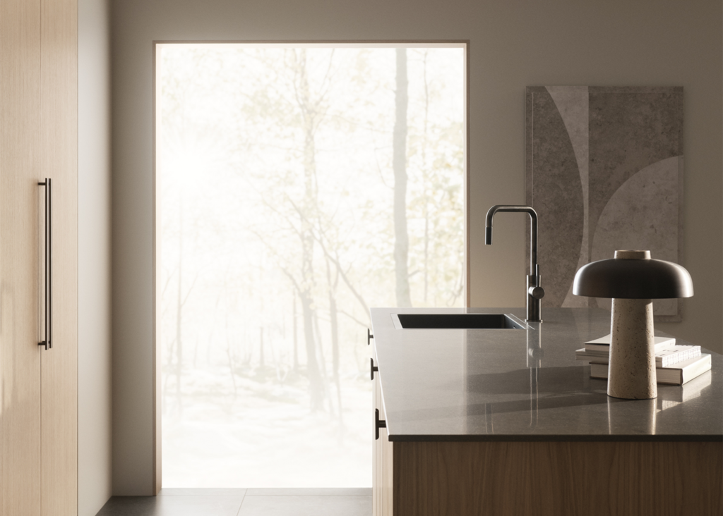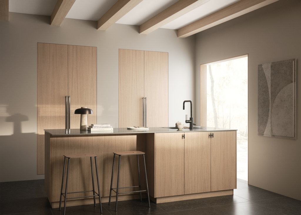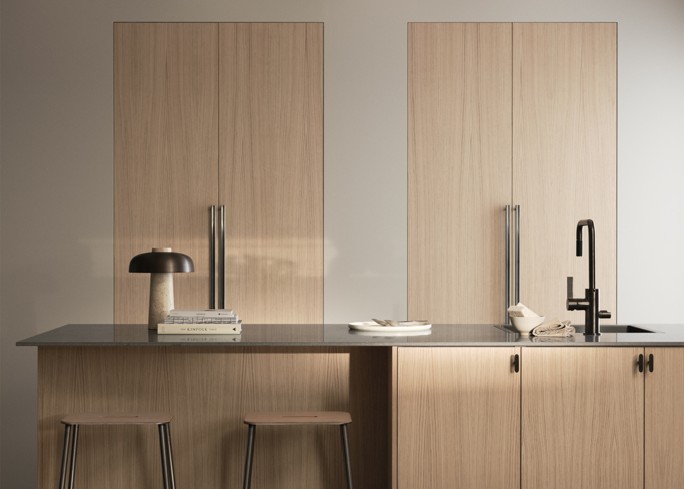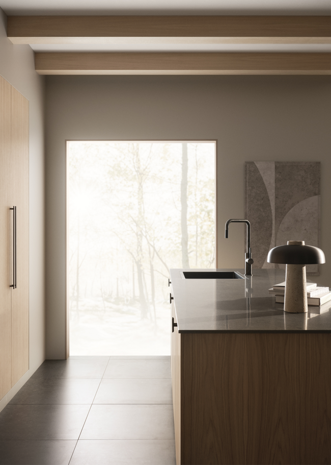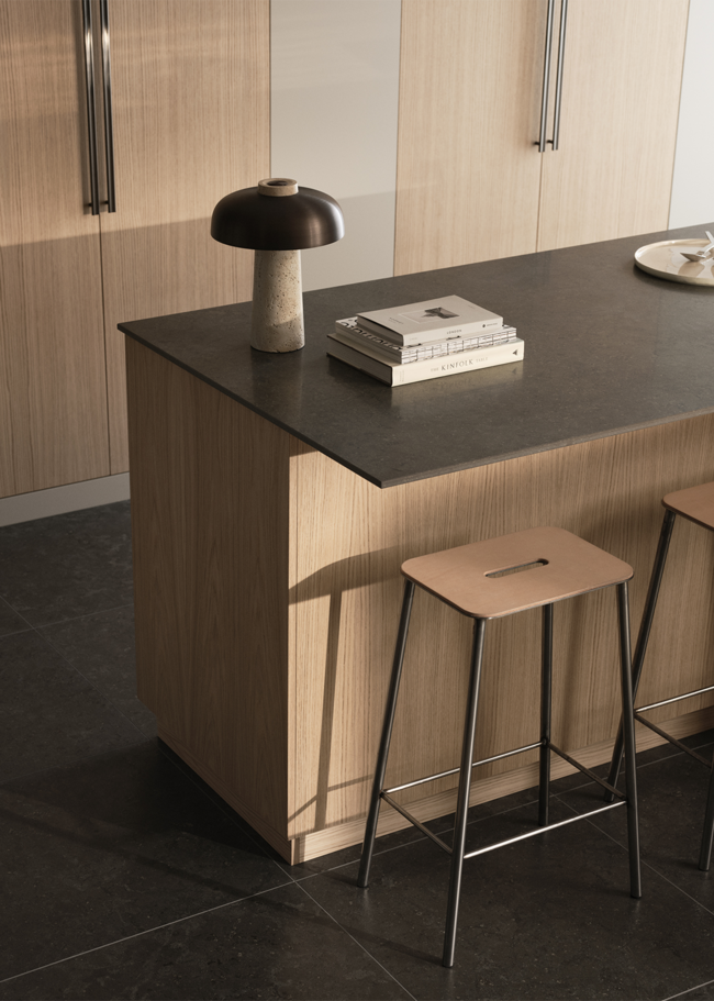 I detta kök med träluckor används en 12 mm tjock bänkskiva ur serien Azul Grey Honed. Den har en semipolerad yta som ger en mjuk lyster, och är tillverkad med 3D.Fit-teknik som skapar ett taktilt mönster som följer stenens naturliga håligheter. Golvet följer samma enhetliga tema och består av plattor i Azul Grey i formatet 60x60 cm.