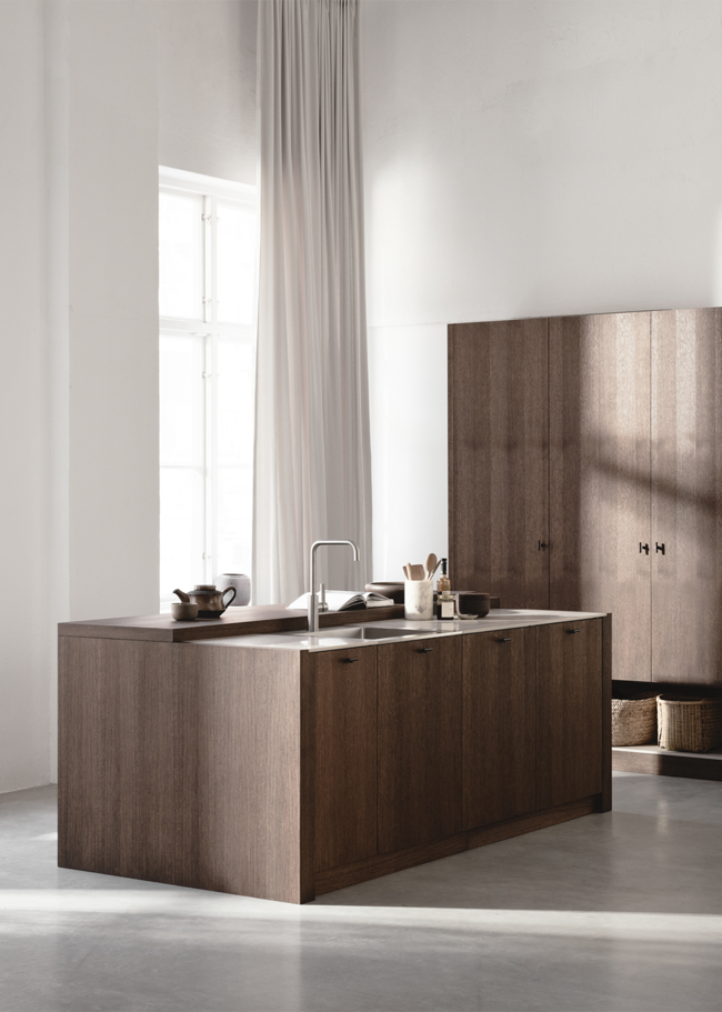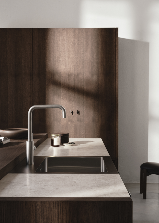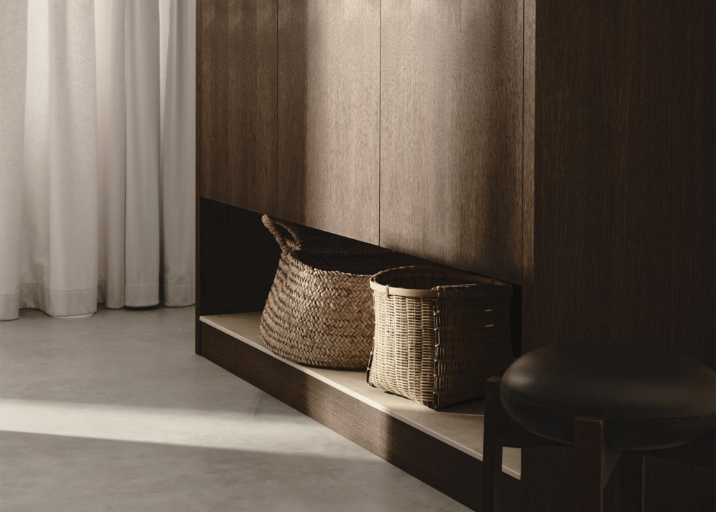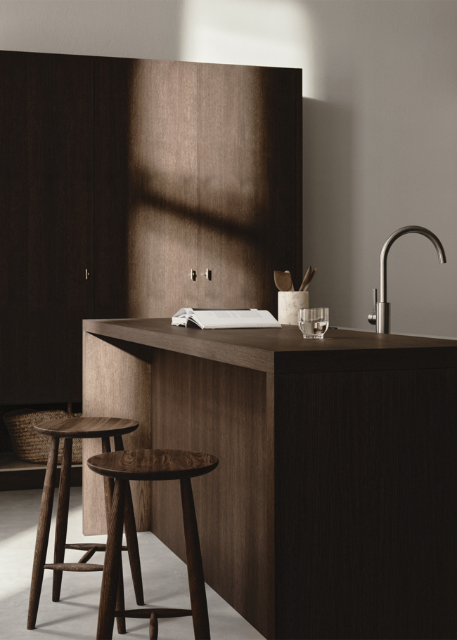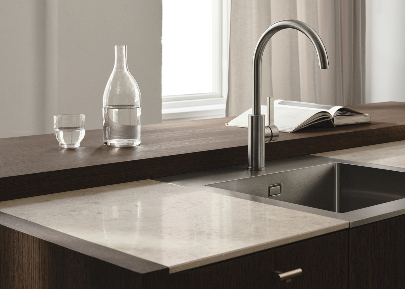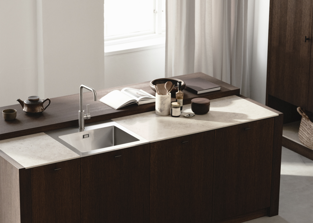 Välkommen till detta luftiga kök där varje detalj har sin plats. Kantningen med bänkskivan i serie Jura Select Ivory Honed, träet och vasken ger tillsammat ett sömlöst utseende. Bänkskivan kombineras av klassisk estetik med modern teknik för att skapa en yta som är både funktionell och vacker. Inspirerad av den populära jurakalkstenen, känd för sina fossilliknande detaljer, håligheter och subtila ådringar, har Jura Select Ivory Honed fångat stenens tidlösa skönhet och anpassat den för dagens behov.