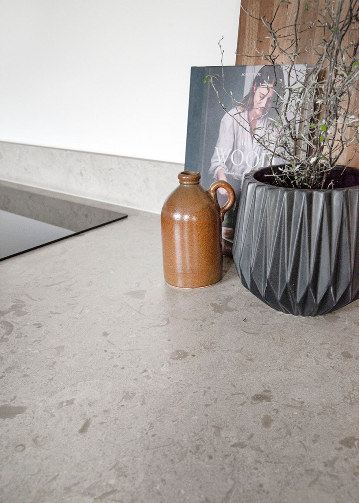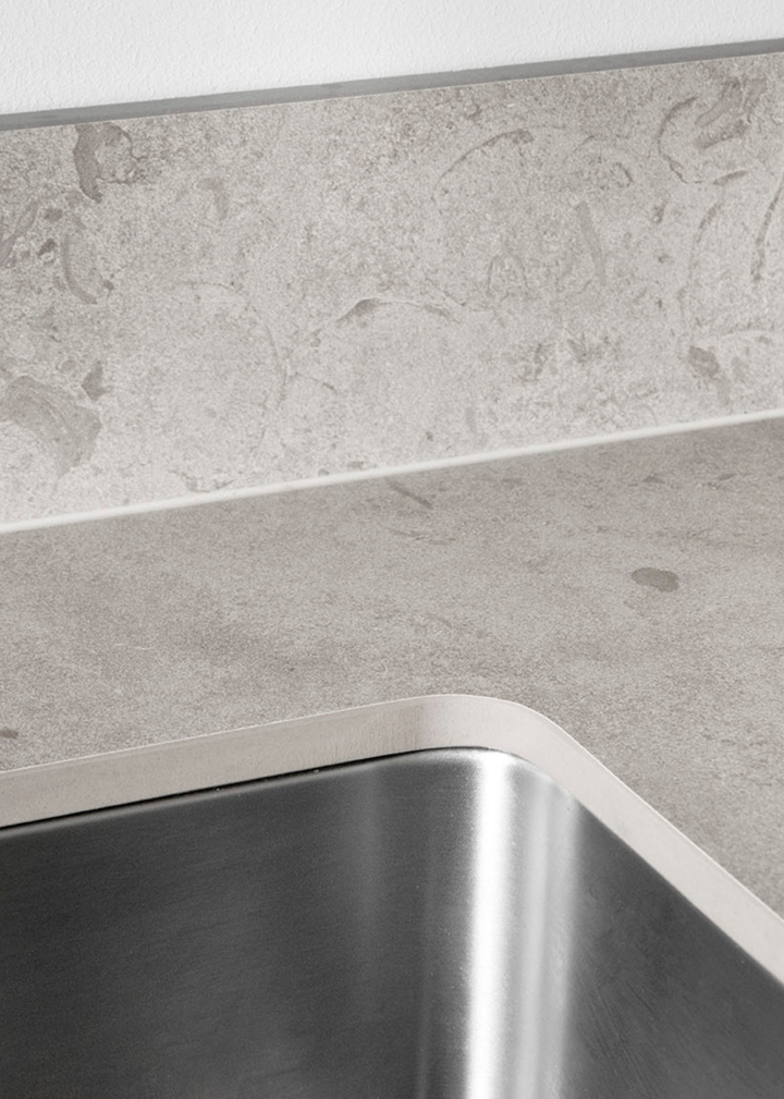 Norrvange Light Grey är en keramisk bänkskiva med matt yta, rik variation med fosiliknande och naturliga detaljer. Skivorna är inspirerade av den Gotländska kalkstenen.