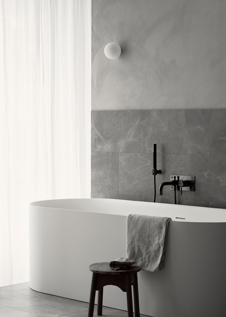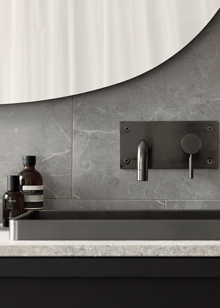 M Grey Fleury Honed har en sammetslen yta och varierar likt marmor i mönster och nyans. Inspirerad av den italienska marmorn Fiore di Bosco som utmärker sig med en vacker ådring och sina livfulla vener.