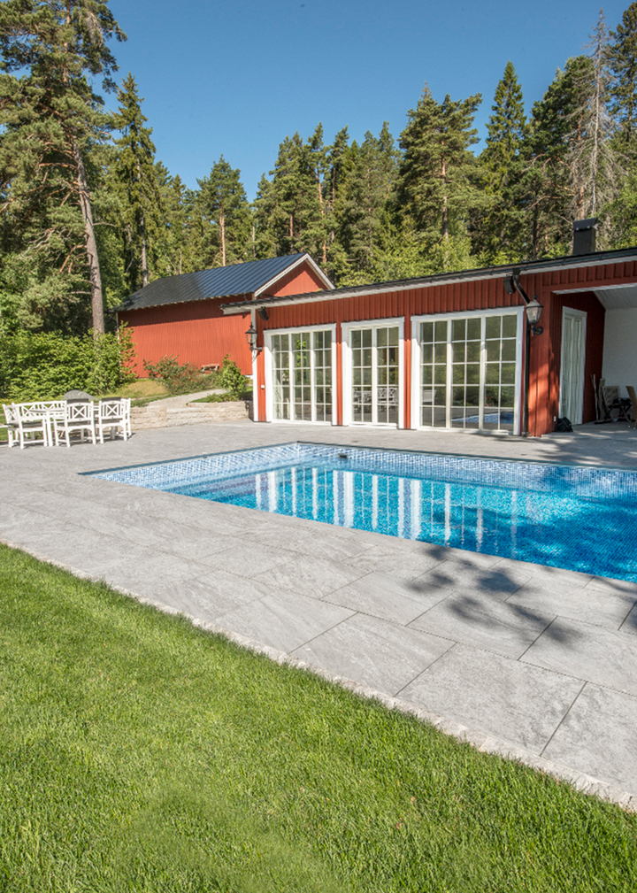 Naturskönt poolområde med plattor inspirerade av skärgårdsklippor i Åkersberga