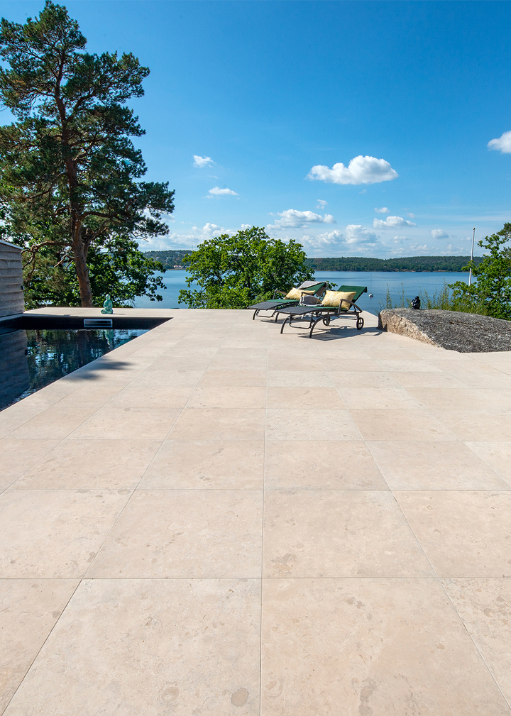 Norrvange Beige är inspirerad av den gotländska kalkstenens naturliga skönhet, och förvandlar altaner, uteplatser och poolområden till avkopplande och harmoniska oaser. De subtila nyansförändringarna och fossilliknande detaljerna i plattornas design ger en autentisk och tidlös känsla som speglar naturens egna texturer.