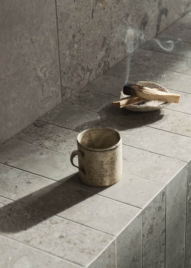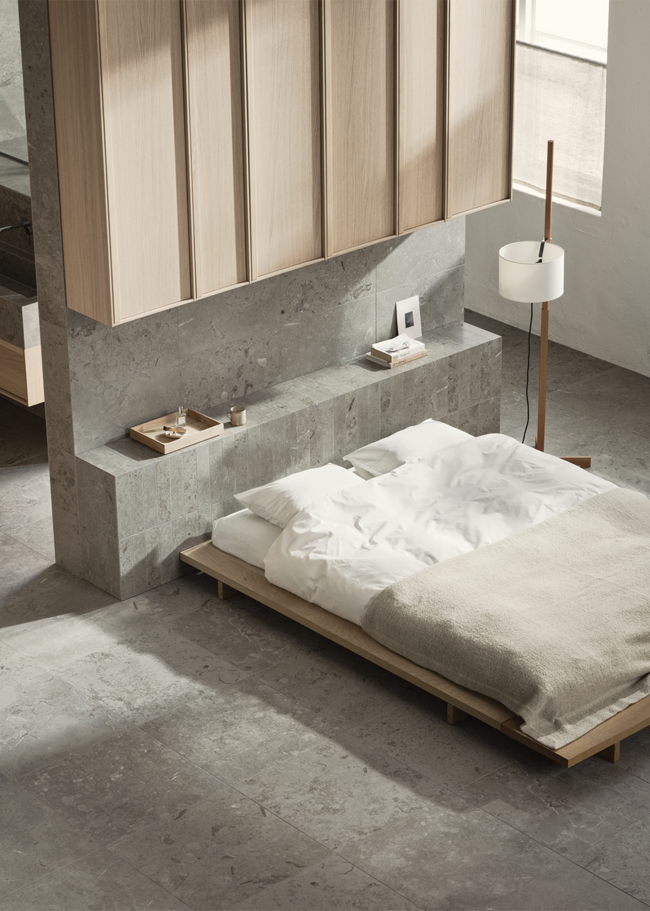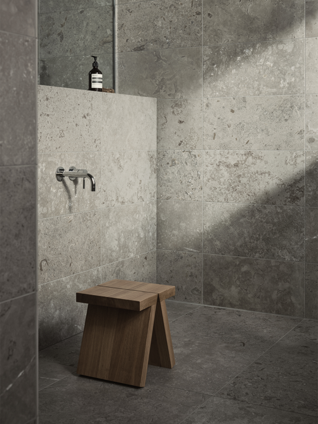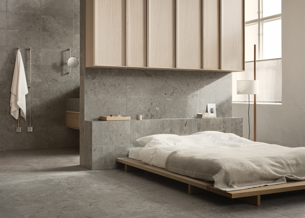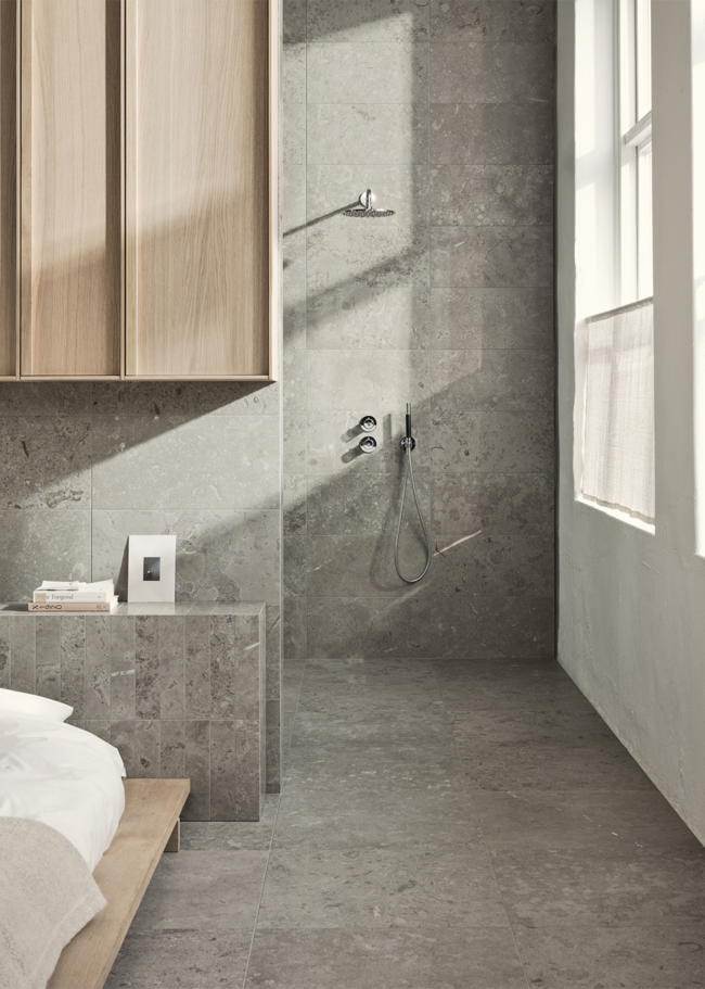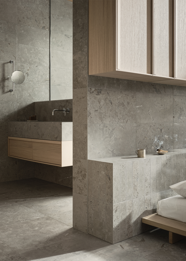 Limestone Select Classic skapar en lyxig och harmonisk atmosfär i detta retreat. Den naturinspirerade ytan bidrar till en lugn miljö där materialets karaktär får ta plats. Den polerade ytan Honed används här i storleken 07x30 på sänggaveln, samt 30x60 på väggarna, medan golvet är utfört i 60x60 i matt yta. Med sin rika och varierande mönsterbild skapar Limestone Select Classic ett mycket naturtroget kalkstensutseende, perfekt för hemmets alla ytor.