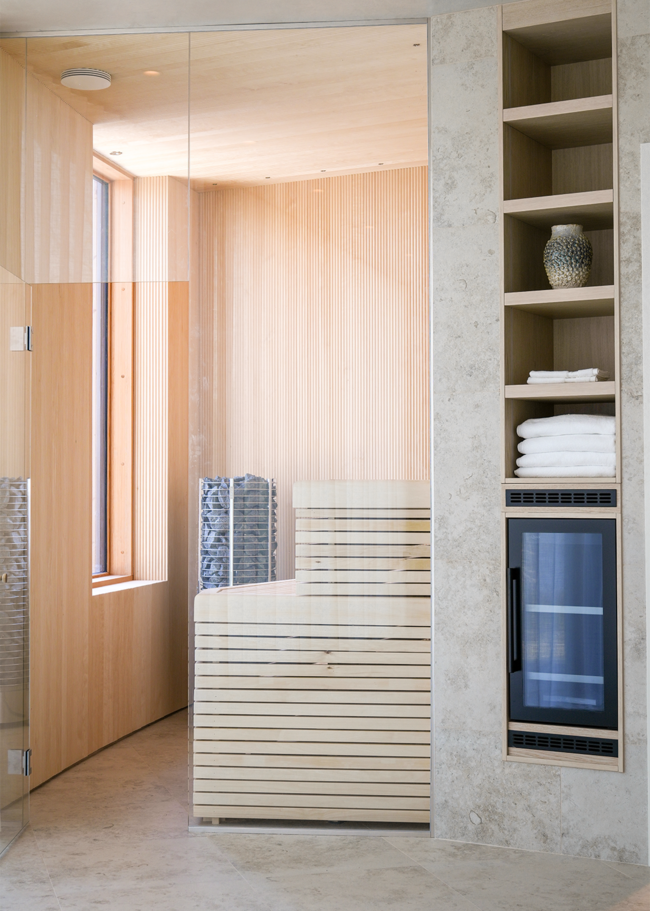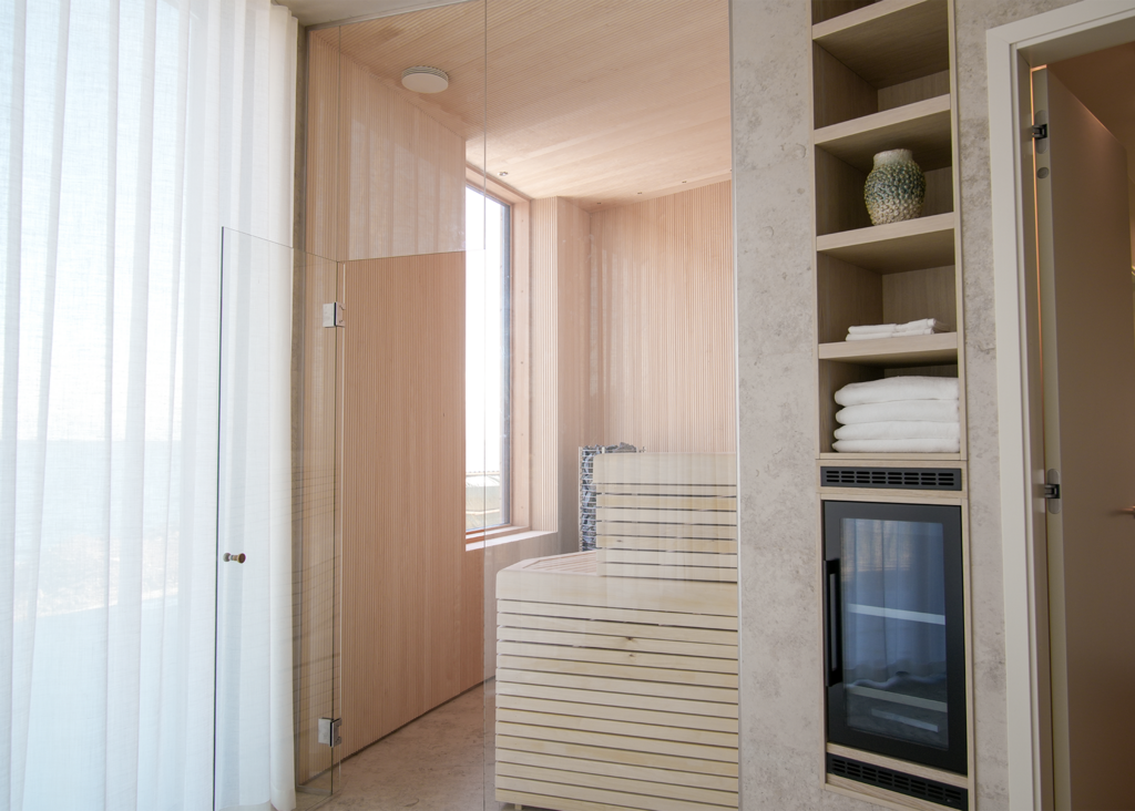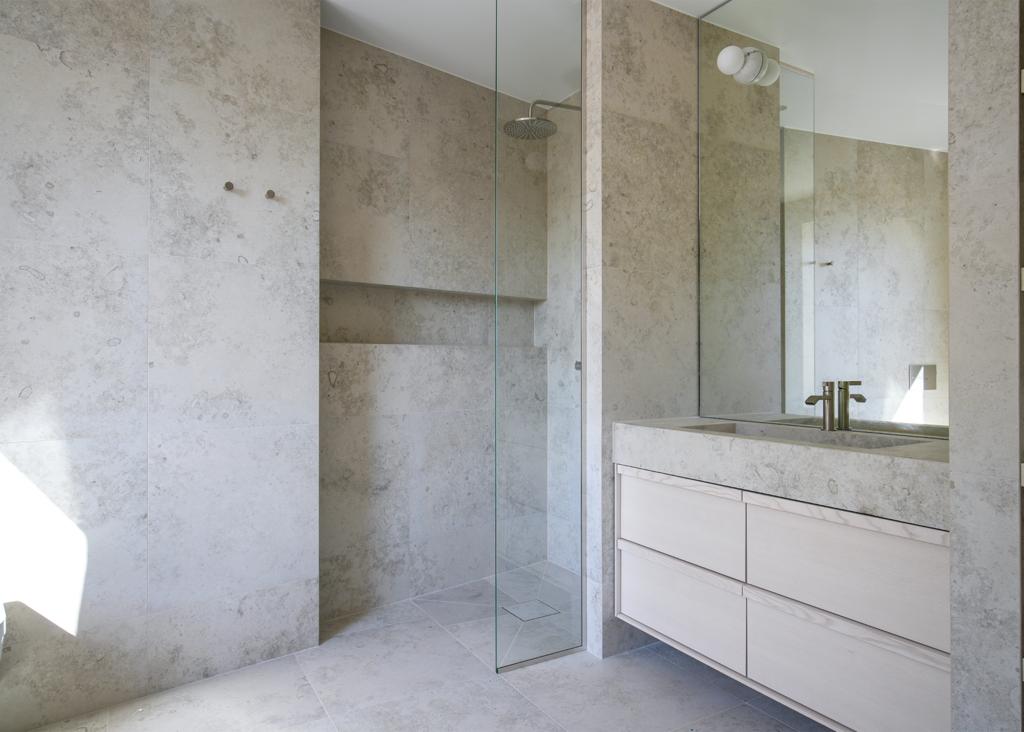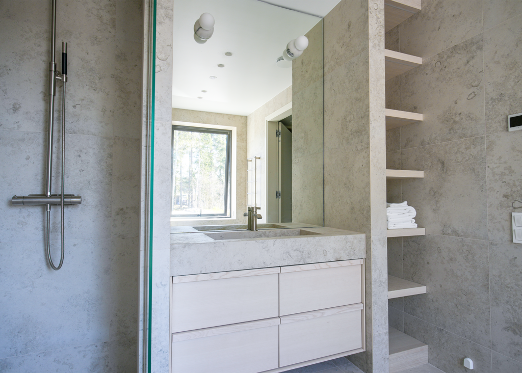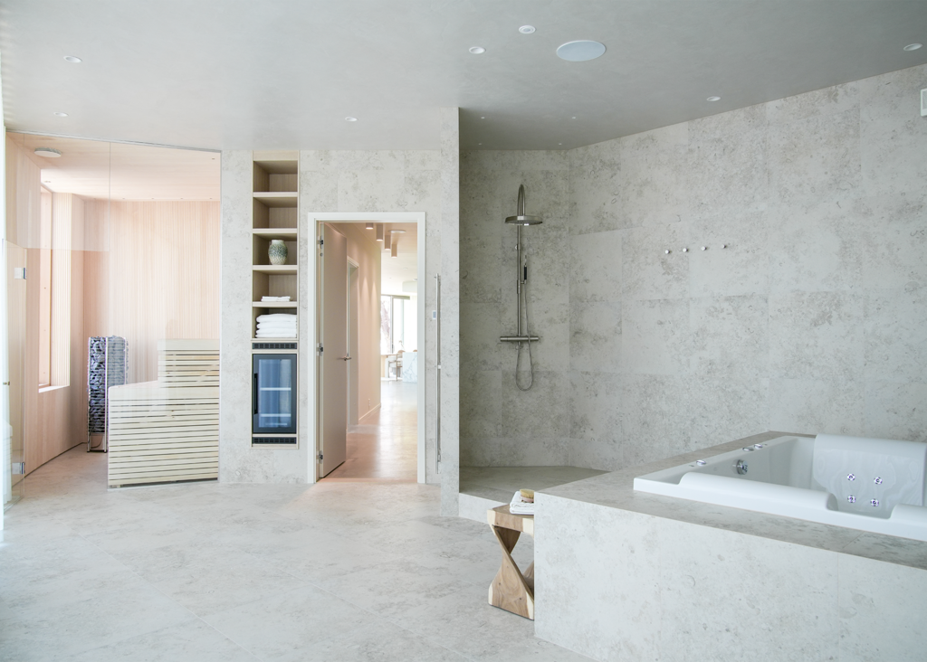 Stig in i denna enastående villa, där varje detalj är noggrant genomtänkt. Här har kunden valt Jura Select Ivory Matt som genomgående tema i relaxavdelningen, med bubbelpool, duch och bastu. Vi finner samma serie i två andra badrum, varav ett med ett badkar med vacker utsikt. I det tredje badrummet används Glanshammar Classic Honed, som pryder golv, väggar och tvättställ med sin tidlösa elegans.