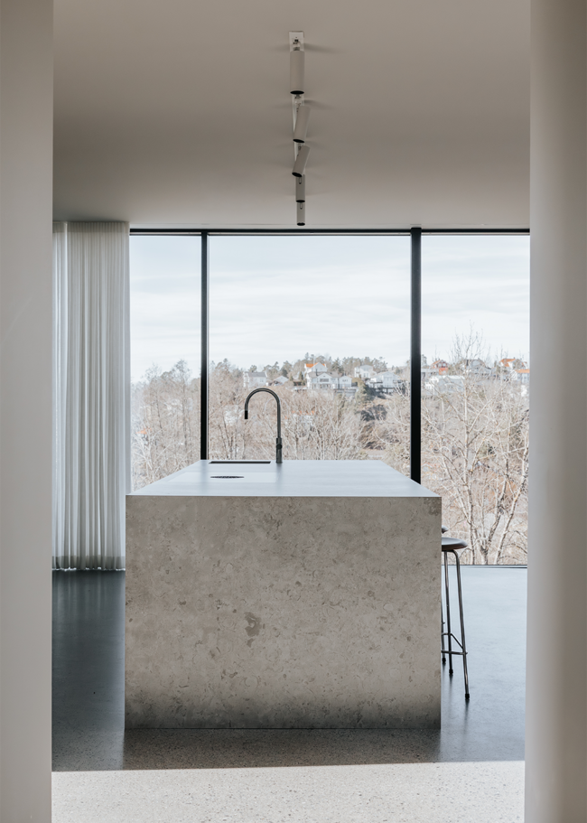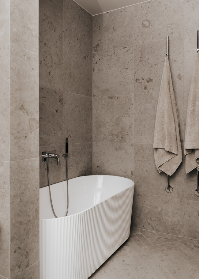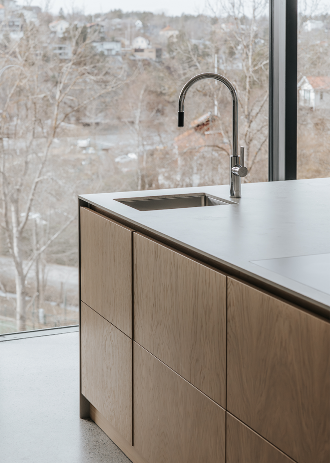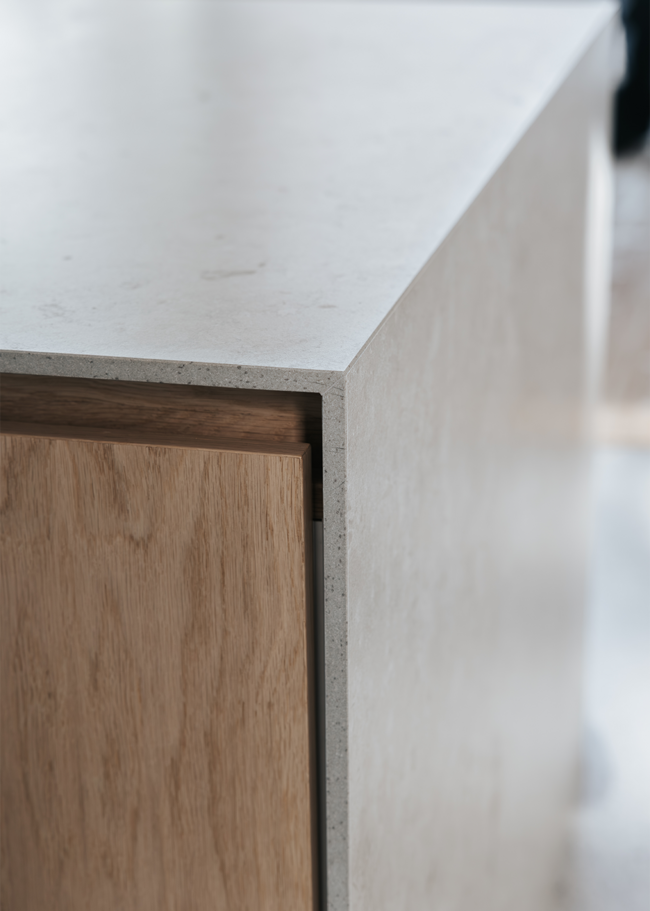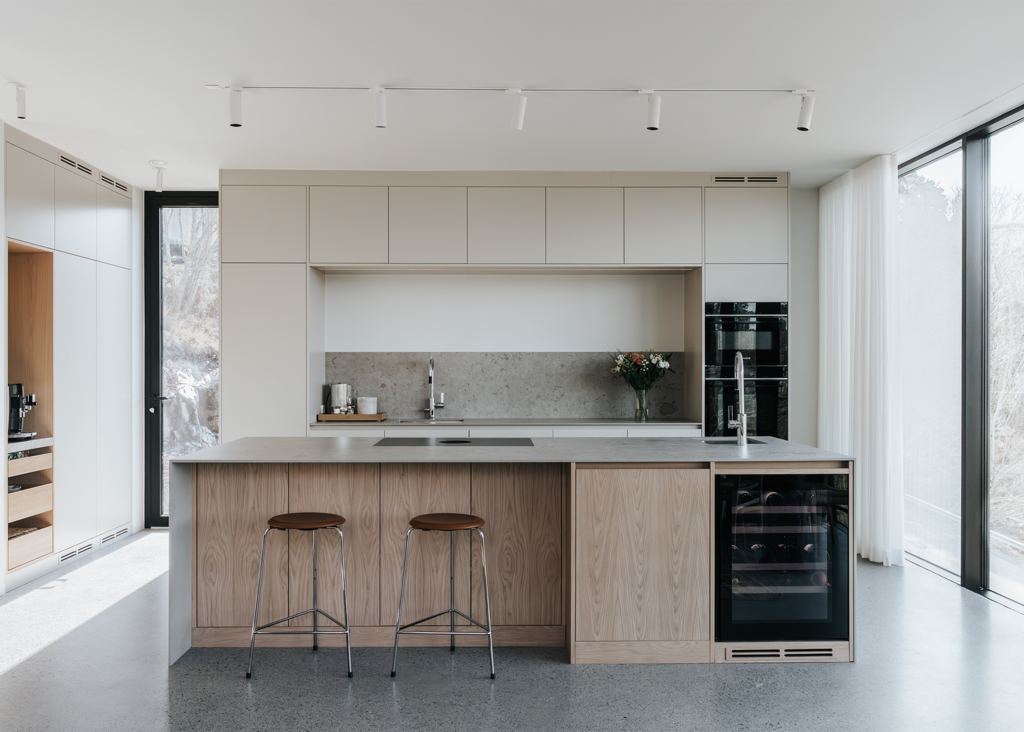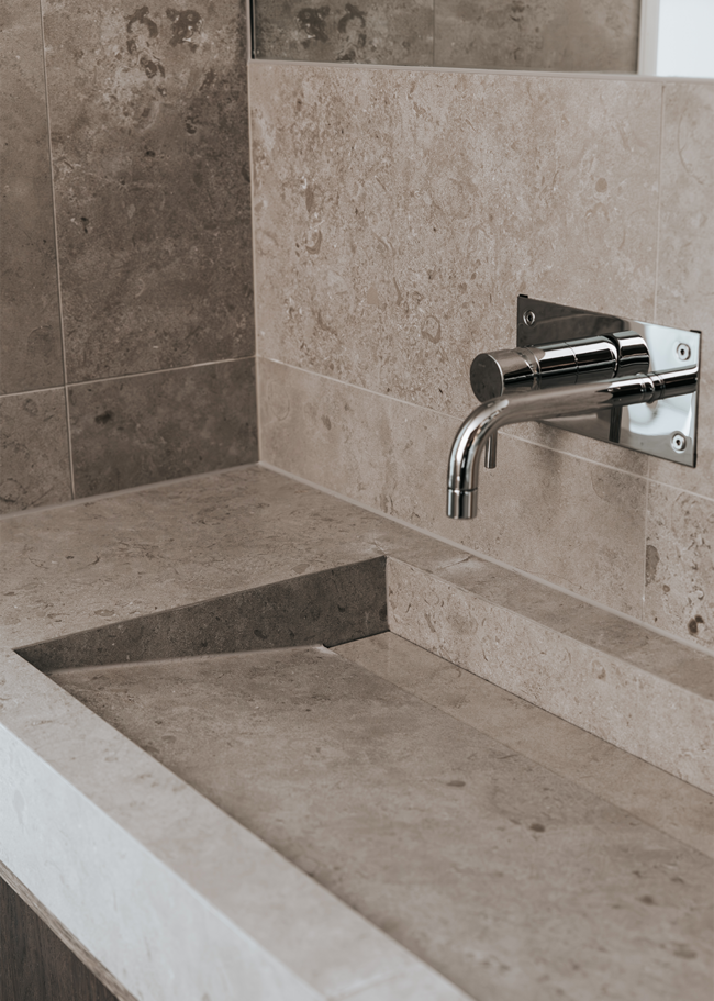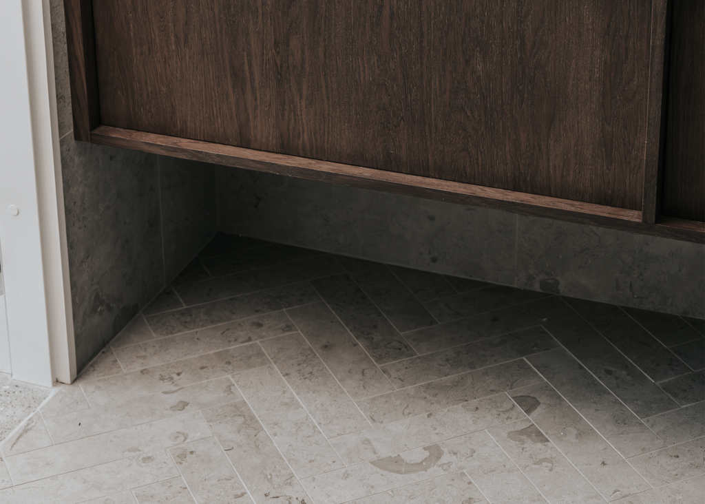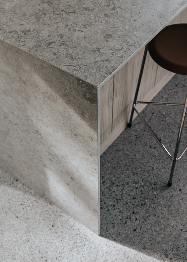 I detta Bricmate House används vår klassiska serie Norrvange Light Grey i både kök och badrum. Serien kännetecknas av fossiler och mörkare skiftningar som ger ett levande och naturligt uttryck. I köket är köksön klädd i Norrvange Light Grey som 12 mm bänkskiva med vattenfallslösning. Samma serie återkommer även som köksskiva och skapar en röd tråd genom hela köket och vidare in i badrummet. Där har ett fiskbensmönster lagts med plattor i 07x30-format, kombinerat med ett inklätt tvättställ och väggplattor i ett större format. Tillsammans skapar rummen en luftig, sammanhållen och naturnära känsla.