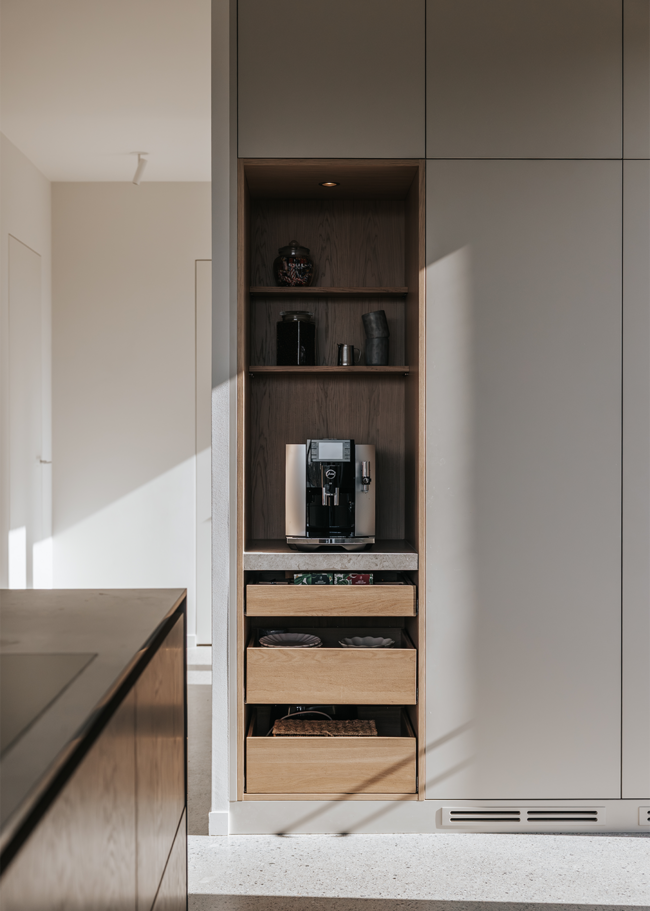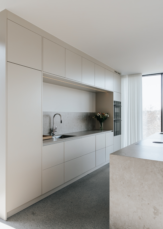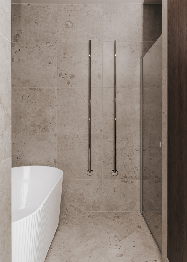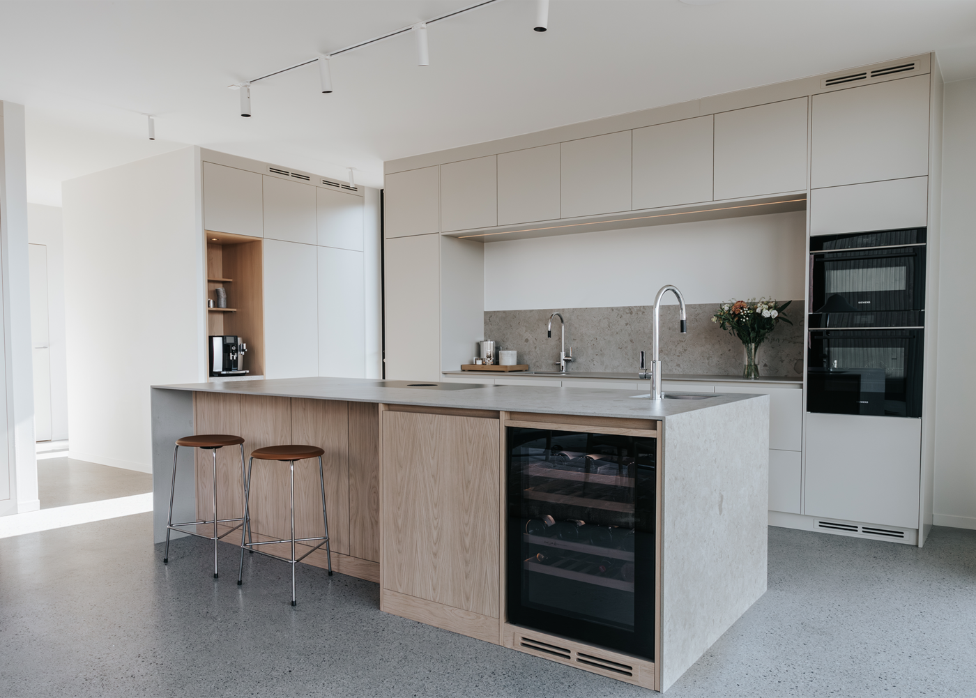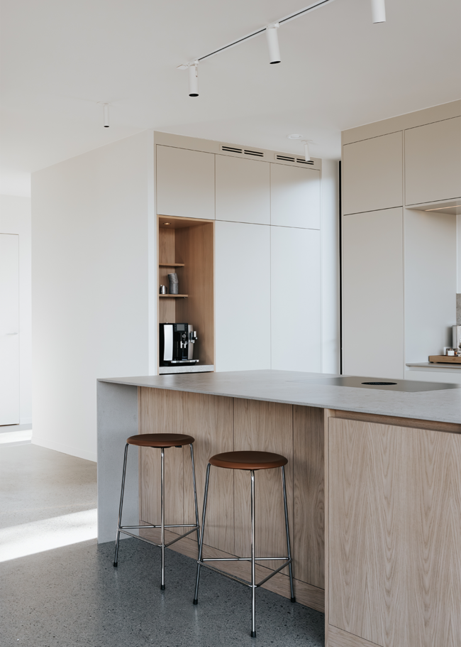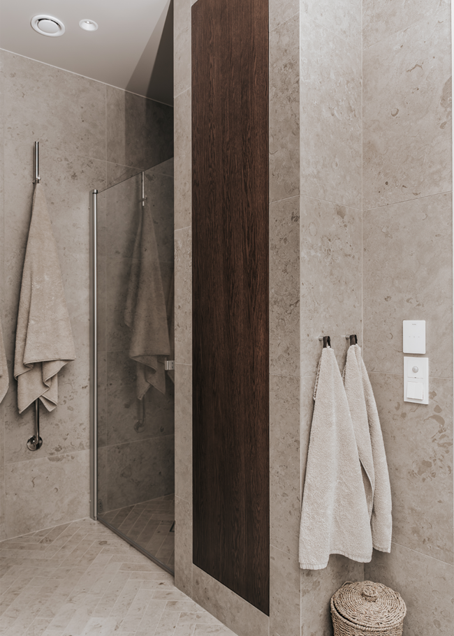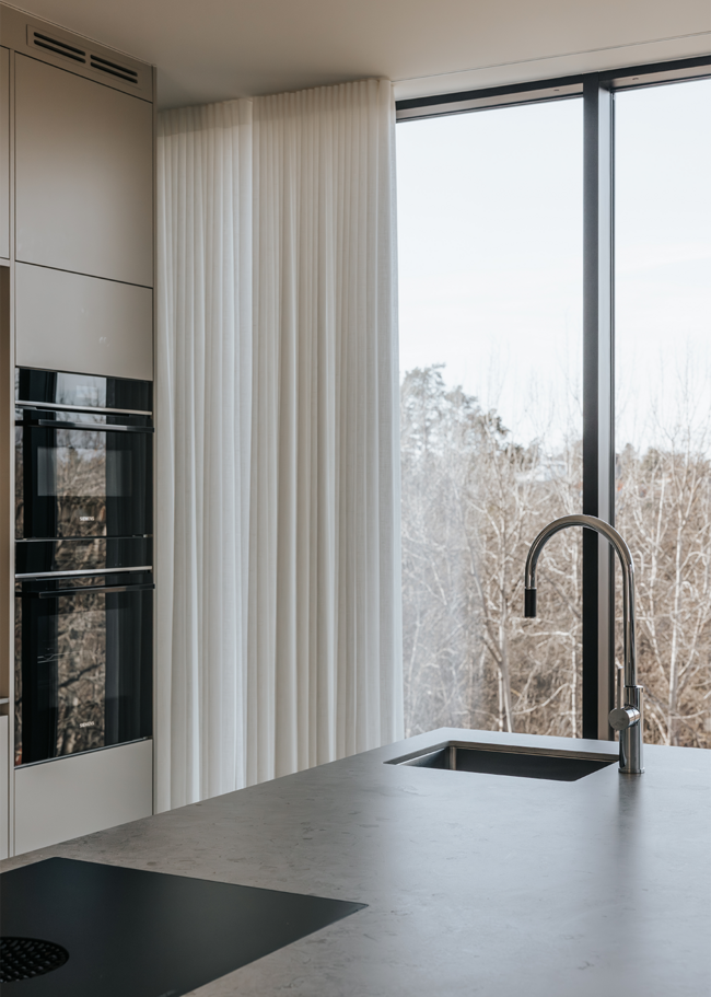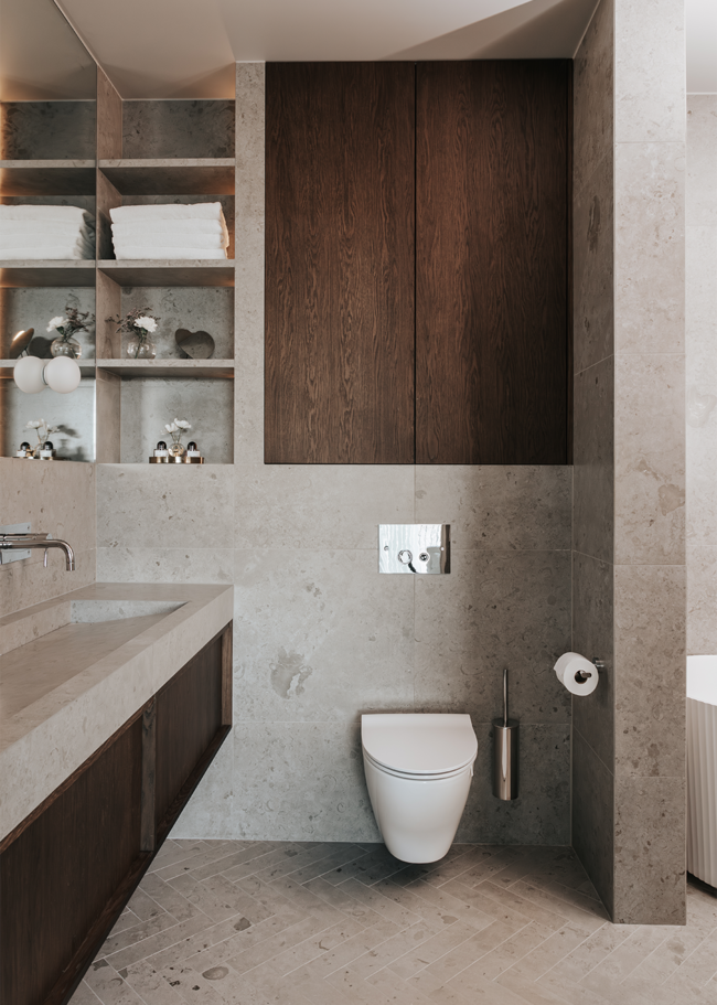 I detta Bricmate House används vår klassiska serie Norrvange Light Grey i både kök och badrum. Serien kännetecknas av fossiler och mörkare skiftningar som ger ett levande och naturligt uttryck. I köket är köksön klädd i Norrvange Light Grey som 12 mm bänkskiva med vattenfallslösning. Samma serie återkommer även som köksskiva och skapar en röd tråd genom hela köket och vidare in i badrummet. Där har ett fiskbensmönster lagts med plattor i 07x30-format, kombinerat med ett inklätt tvättställ och väggplattor i ett större format. Tillsammans skapar rummen en luftig, sammanhållen och naturnära känsla.